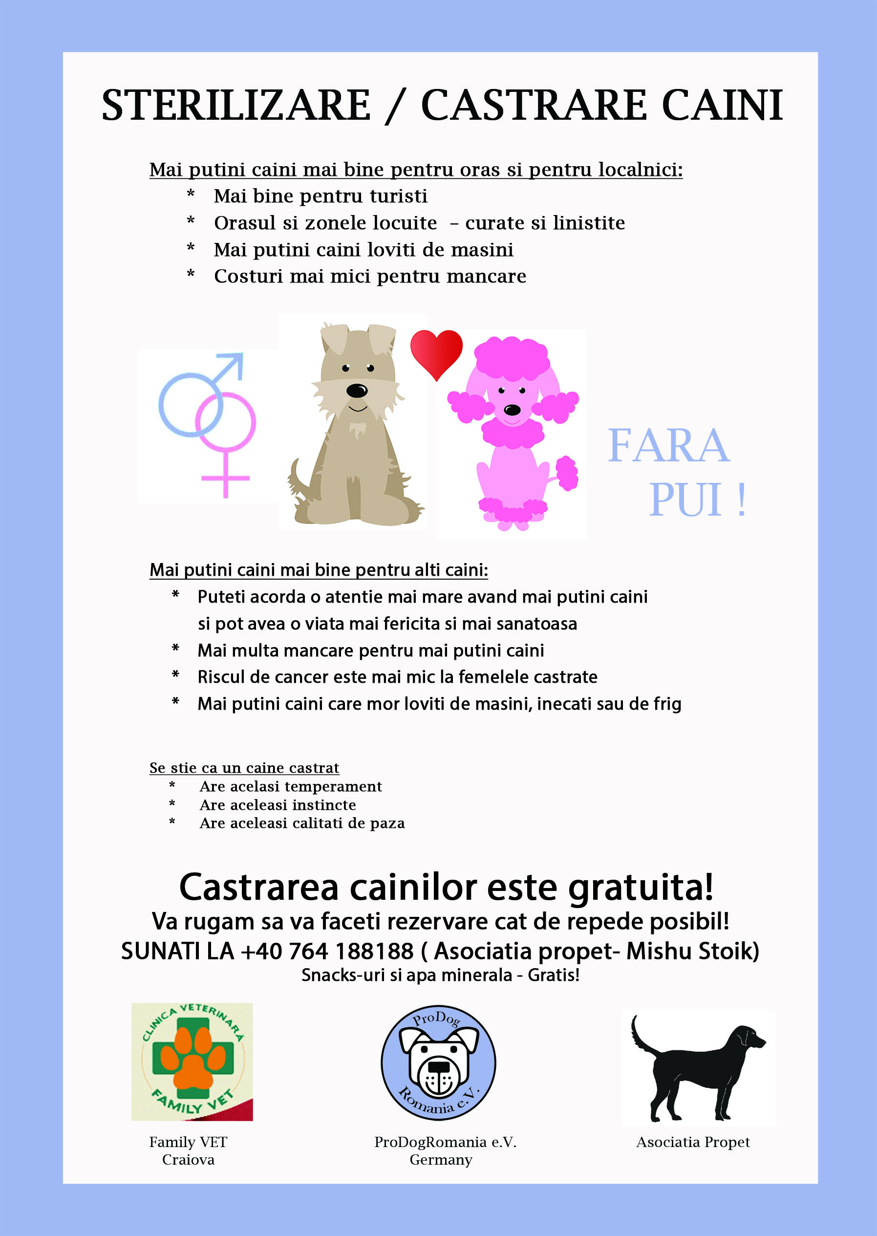 Um die Bewohner (deren viele Hunde in Rumänien frei auf der Straße leben und sich dort permanent vermehren) zu überzeugen, dass das Kastrieren dringend notwendig ist, haben wir Poster und Flyer entworfen, die in Baile Herculane ausgehängt und verteilt werden.
