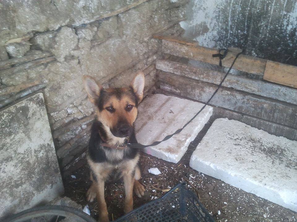 Sie hängt nun an einer 1m langen Leine/Kette unter einer Art Verschlag. Das Dach ist nicht dicht, sie wird durch und durch nass, wenn es regnet. Gefüttert wird sie mit altem Brot, was sie aber verweigert.
