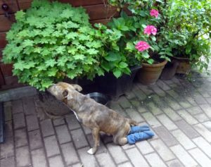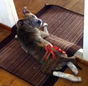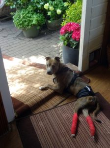 Natürlich benötigt Wheeli mehr „Aufwand“ als ein gesunder Hund, er benötigt seine Windeln und seine Hinterläufe müssen durch Verbände oder einen Rutschsack geschützt werden.