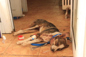 Als wir in Zwinger Nummer 87 standen, und alles aktuell ziemlich ruhig schien – es war auch wieder fantastisch heiß heute und auch die Hunde machen dann Siesta – fiel Katja im Nachbarkennel ein Hund auf, und sie fragte, ob es normal ist, dass da einer so entspannt in der Ecke auf der Seite liegt. Entspannt auf der Seite liegen? Bucov? Nein – sehr untypisch, Hunde liegen entspannt auf der Seite, wenn sie sich sehr sicher fühlen und wirklich abschalten. Das macht hier keiner in Bucov, der nicht völlig entkräftet und fertig ist. Katja und ich packten also zügig wieder unsere Sachen ein, gingen zu Kennel Nummer 84 und schauten uns den Hund, der sich als Hündin entpuppte, genauer an. Atmung flach, Lefzen blaß, Hals total nass und rot… Die Hündin schien im Schockzustand zu sein, sie war nicht ansprechbar und zeigte keine Reaktion auf unsere vorsichtigen Berührungen. Mir war klar: Wieder jemand, der gebissen und attackiert wurde und durch den Zwinger geschleift worden war. Furchtbar…sie war so zart und lag dort im Staub und in den Kieselsteinen. Aber mir fielen die vielen Fliegen an ihrem Bauch auf und als ich sie verscheucht hatte, sah ich: Ihre Kastrationsnaht schien offen zu sein und …. im Bauchraum befanden sich Maden. So etwas hatte ich auch noch nicht live erlebt und mir wurde anders. Ich schickte Katja loß, damit sie schnell Irina holte, denn ich wusste ehrlich gesagt nicht, wie ich diese Hündin transportieren sollte. Hals voller Blut, offene Wunde, Bauchraum voller Maden, sie im Schockzustand. So etwas hat man irgendwie nicht oft. Und ich war überfordert. Irina kam sofort, schaut sich das Elend an und war auch sichtlich getroffen. Sie nahm sie vorsichtig hoch und die Hündin ließ alles mit sich geschehen. Als wir am Vetgebäude ankamen, wurde die Hündin sofort an den Tropf gehängt, sie bekam Schmerzmittel, Irina entfernte die Maden, desinfizierte, spülte, reinigte und spritze noch einige andere Dinge…Katja und ich waren beeindruckt, wie routiniert und sicher Irina mit dieser Situation umging, wie sie die Hündin anfasste und ihr gut zusprach. Irina hat leider keine großen Hoffnungen, denn ihre Erfahrung ist, wenn Hunde in diesem komatösen Schockzustand sind, sind sie nur schwierig wieder ins Leben zu holen. Wir fragen morgen nach ihr…:(