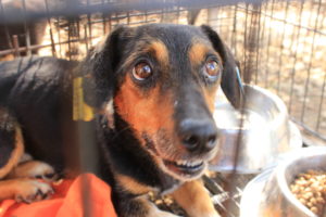 Der kleine Dackelrüde wurde auch ständig durch die Gegend gekickt von anderen Hunden. Irina hat ihn in einer kleinen Gitterbox notfallmäßig untergebracht…