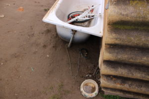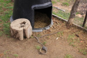 Weiter ging es zu einem kleinen separaten Grundstück, was völlig abgezäunt und mit Holz abgeschottet war. Dort stand eine Badewanne, an der mit einer massiven Kette ein kleines Kerlchen fixiert war. 🙁 Er wurde als erstes befreit und war sehr freundlich, als wir ihn in die Box setzten.