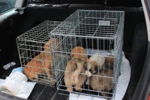 Wir wurden zu einem Holzverschlag geführt, der völlig dunkel war und mit Stroh gefüllt war. Dort wurden drei Welpen herausgeholt, die völlig versteinert waren, zwei braune und ein weißer.