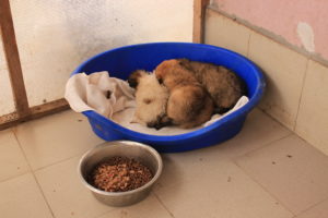 Wir fuhren ins Tierheim, brachten die Welpen in die Quarantäne, weil sie alle drei nicht gut aussahen. Sie sind sehr verwurmt und man merkte, dass sie bisher wenig Bewegung hatten. Sie konnten kaum laufen, fielen immer wieder um. Auch das Licht schienen sie nicht gewohnt zu sein. Heute Abend ging es aber schon deutlich besser, sie konnten zu den Näpfen laufen. Morgen werden sie Tierärztin Andreea vorgestellt.
