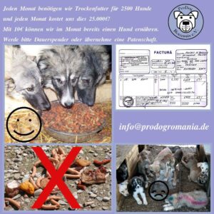 Ohne genügend Trockenfutter können die Hunde nicht überleben. Jeden Monat brauchen wir für 2500 Hunde 25.000€. 10€ reicht bereits um einen Hund einen Monat lang zu ernähren.