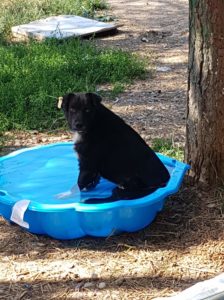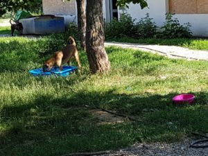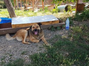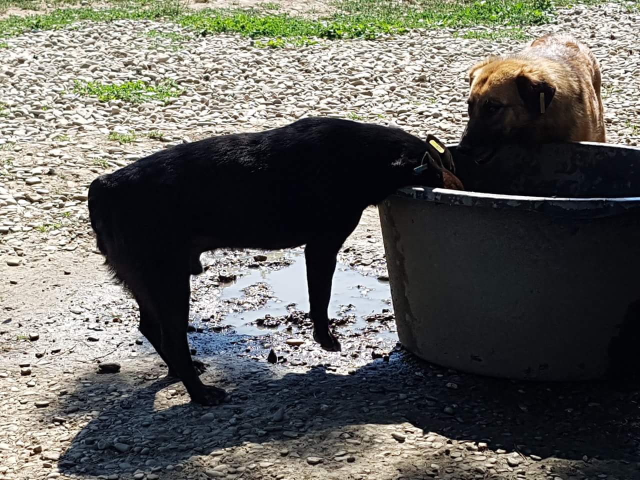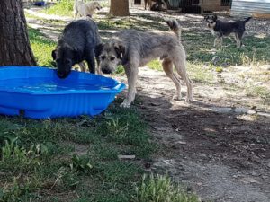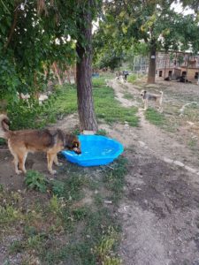 Wir sehen uns an und wissen, dass wir jetzt schauen sollten, ob diese tollen Hunde in der Hitze ebenfalls genug Wasser finden werden. Wir holen Wannen (DANKE für die Spenden!!!) und verteilen diese auf dem Freigelände.