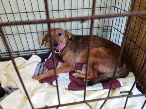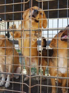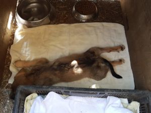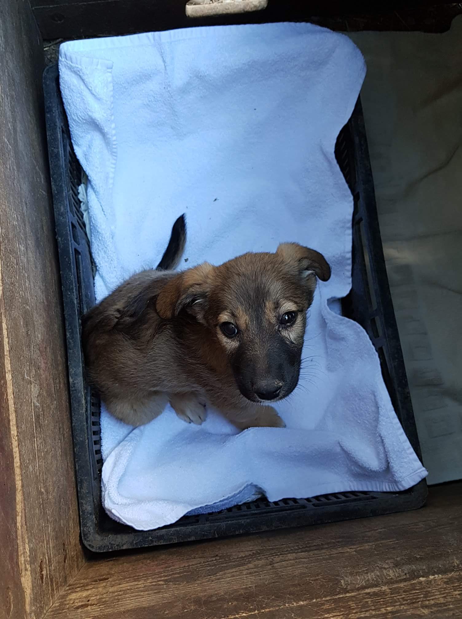 Auf dem Weg zurück ins Büro fällt uns dann ein berührendes Winseln auf. In einem Käfig auf Rollen sitzt ein bildhübscher brauner Jagthundwelpe…allein…auf 1,7 Qudratmeter…wir sind so froh, dass wir über ihn „gestolpert“sind. Wir machen uns auf die Suche nach einem passenden Platz für diesen schönen Hund. Sein Jaulen verändert sich, nach dem wir einen sehr gut passenden Kennel gefunden haben und wir sind sicher, dass es dem wundervollen, kleinen Helden gut gehen wird. Wir warten eine ganze Weile ob die Hund gut miteinander umgehen…. das tun sie ❤