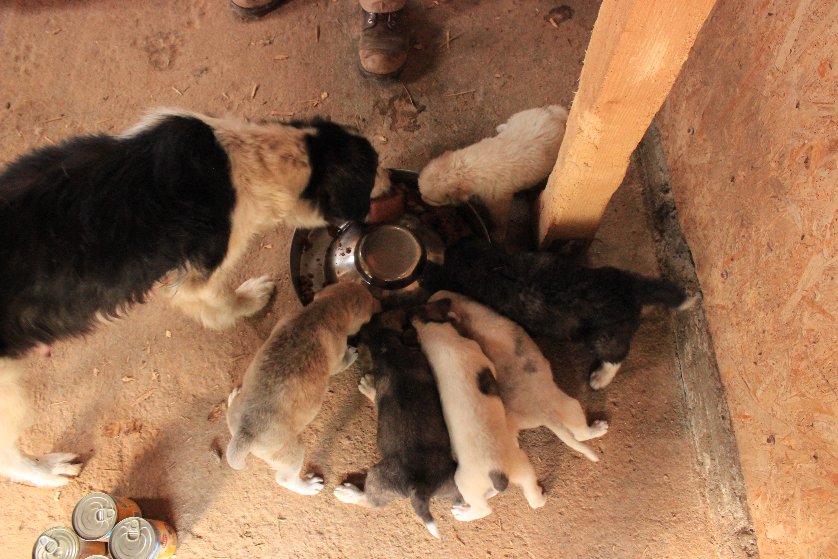 Auch unsere Mama von gestern mit ihren 7 Welpen haben wir ausreichend versorgt. Sie ist klapperdürr und wir füttern nun auch die kleinen Welpen schon mit Nassfutter zu, damit sie weniger säugen muss. Sie schlägt sich tapfer…Wir haben sie MIRASU getauft. Ein Schatz. Morgen ist Vetcheck für die family.