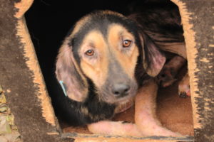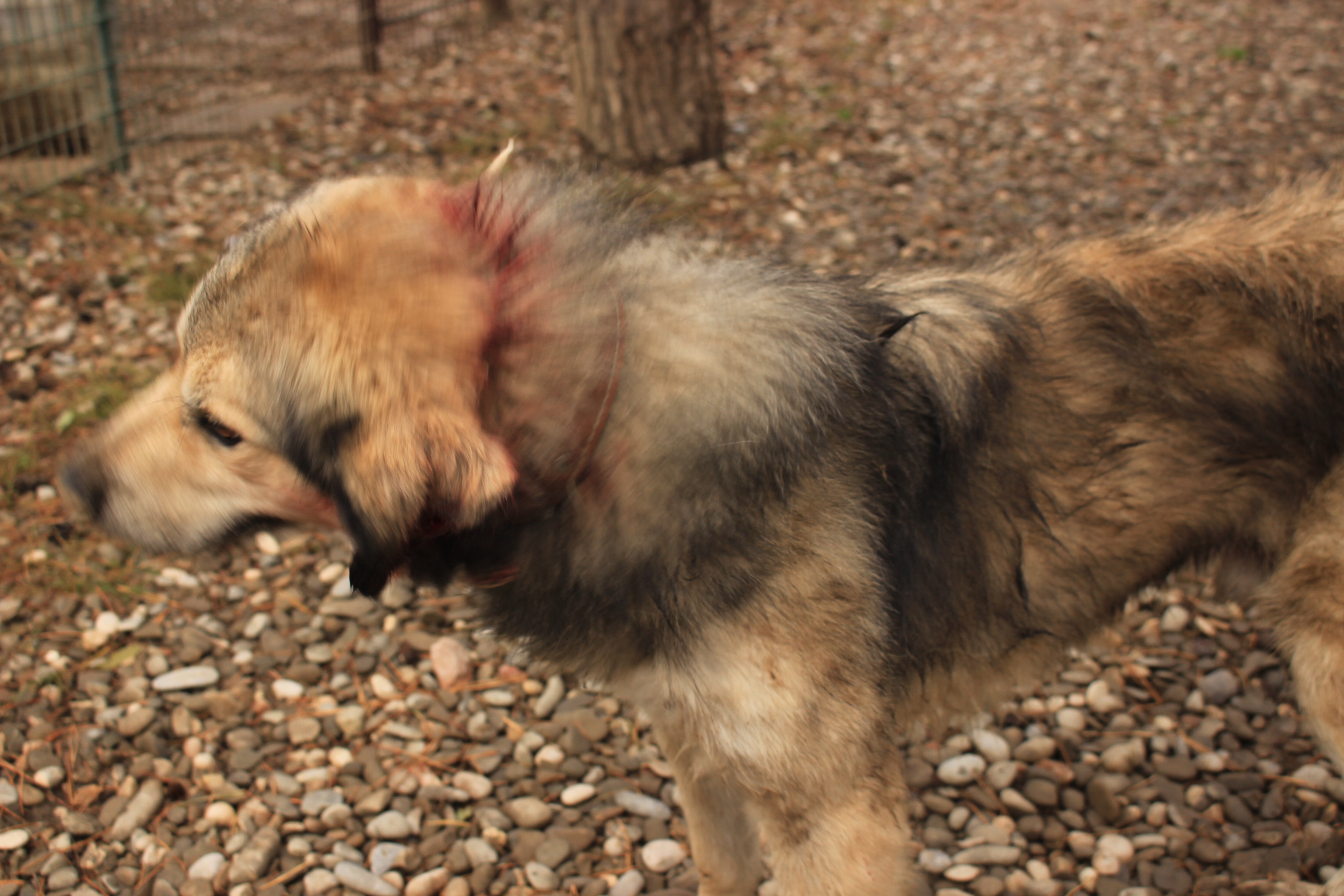 Als wir gerade in Kennel 17 standen und Fotos machten, Ohrmarken ablasen und Krallen schnitten, brach quer gegenüber im Kennel ein riesen Tumult los. Man hatte sofort unmittelbar Adrenalin im ganzen Körper, denn mittlerweile kennt man die Arten von Gebelle, die es hier gebt. Es gibt das „Wir haben Hunger“ Gebelle, das „uns ist langweilig“ Gebelle, das „ich finde meinen Nachbar ganz furchtbar“ Gebelle und das Gebelle, wenn eine Gruppe von Hunden einen einzelnen Hund umbringen möchte. Unmittelbar und sofort und mit aller Kraft. Und wir hörten das Gebelle aus eben dieser Kategorie, Kategorie dunkelrot. Und der Kollege hatte wirklich Glück. Unser Zwingertür von Kennel 17 ging sehr schnell auf, kein minutenlanges Gedrücke von verbogenen Türriegeln, keine Hunde, die mitraus wollten. Und vor dem Kennel, wo die Fetzen flogen stand eine Schubkarre mit einer Schaufel.  Das Opfer wurde nicht nur von dem eigenen Kennel attackierte, sondern der Nachbarkennel begann bereits, ihn durch den Zaun am Rückenfell zu zerren. Furchtbar. Also nicht lange Fackeln, Schippe in die Hand, und richtig viel Krach machen, ablenken, umlenken, damit sie bloß loslassen. Doch es reichte nicht, wir mussten in den Kennel. Also auch da Türriegel auf und zack rein. Und bloß nicht zucken, zimperlich sein oder Unsicherheit zeigen. Dann kann sich der Spieß sehr schnell rumdrehen und man selber wird angegriffen. Solch eine Situation ist nicht gerade ohne und voll mit Adrenalin, bei uns wie bei den Hunden… Aber wir waren anscheinend überzeugend und alle Angreifer ließen los, das Opfer – wir haben ihn MILOSCH     genannt, raffte sich auf und kam sofort zu uns, stellte sich zitternd an unsere Beine, das Blut lief… Wir machten einfach erst mal die Zwingertür auf und MILOSCH klebte an unseren Beinen…kurz mit der Moxon Leine gesicherten machten wir den ersten Check Up…Ohr eingerissen, Verletzung am Oberschenkel, super gestresst, aber super lieb…  Catalina und wir entschieden uns nun für einen ersten Notfall Platz, wo nur eine Hündin lebte, die gestern abgegeben wurde…. MILOSCH ging sofort in die Hütte und auch heute Abend schlief er dort fest. Was für eine Aufregung… aber MILOSCH hat es geschafft!