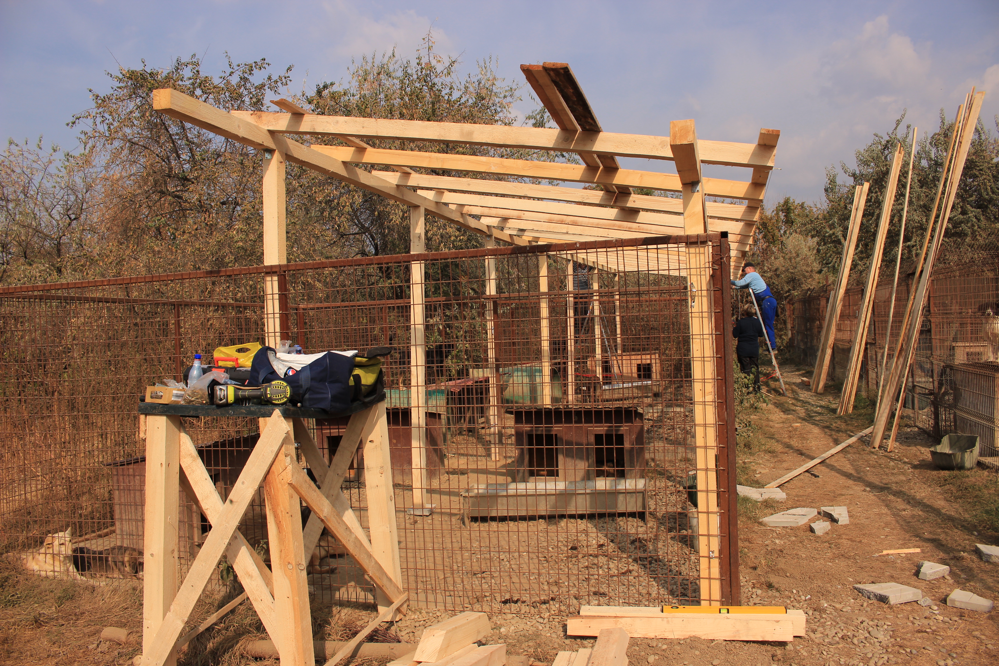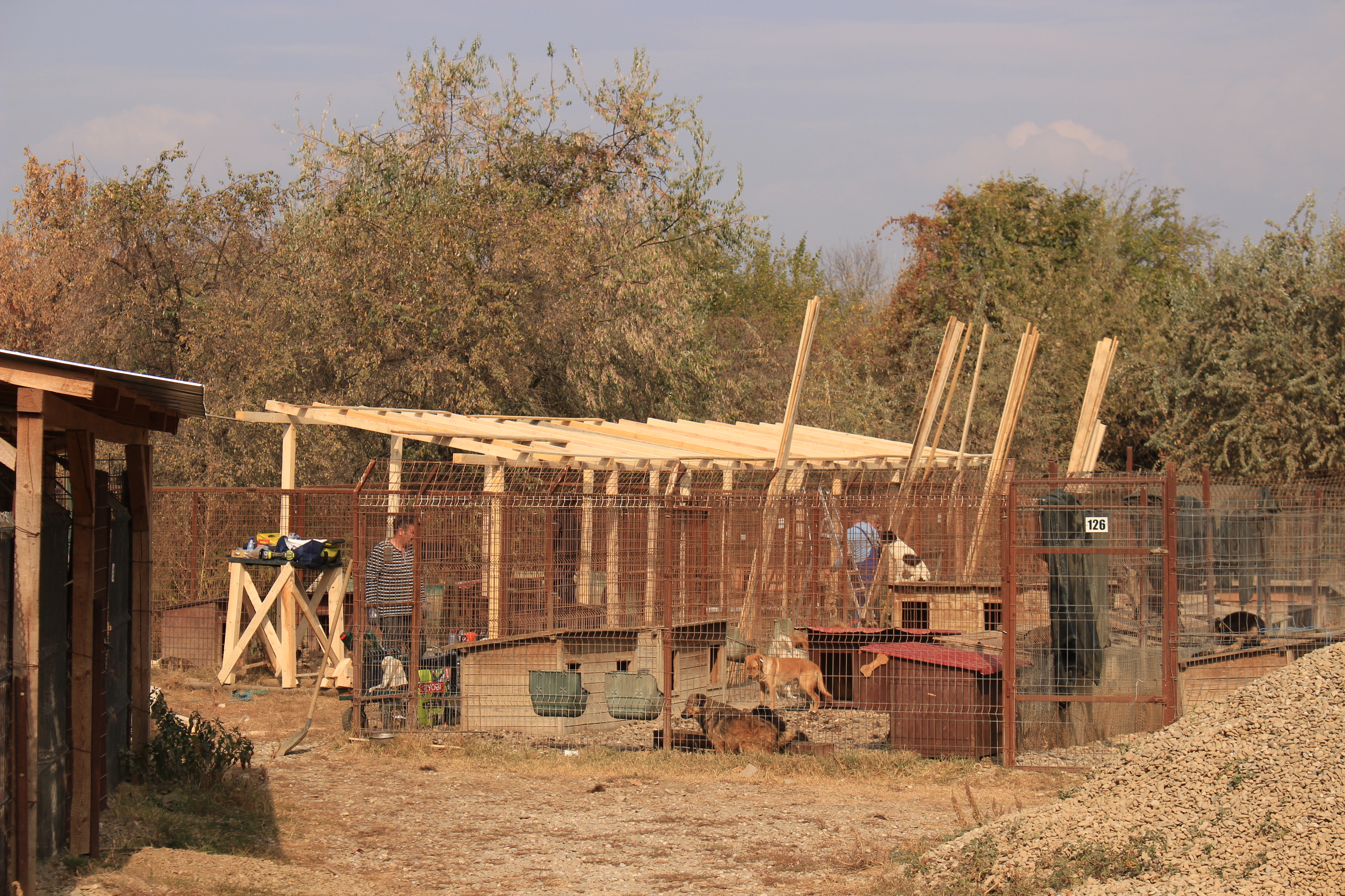 Pünktlich um halb 8 ging es los zum Einkaufsmarkt mit allen ( mehr als 20 Leute sind wir bei diesem Einsatz), man besorgte sich Nahrungsmittel für den Tag, trank zusammen den ersten Kaffee und kurz nach 8 standen wir alle gemeinsam in Bucov. Wie immer starteten wir unseren Rundgang, zeigten neuen Aktiven die bisherigen Fortschritte und besprachen, wo neue Dächer errichtet werden sollen. Das Holz war gestern schon bestellt worden und kam auch pünktlich heute morgen in Bucov an. Auf unserem ersten Rundgang gab es leider direkt zwei unschöne Dinge zu erleben. Eine sehr dünne Hündin wurde gerade schwer in die Mangel genommen und von ihren Zwingerkollegen angegriffen. Zum Glück waren wir dort, konnten das Schlimmste verhindern. Sie hatte aber große Wunden und wurde durch Tierärztin Catalina versorgt und in den vetkennels geparkt. Ein paar Zwinger weiter lag mittig ein großer toter Hund, den wir aus dem Kennel herausholten. Einen starren Hund zu tragen gehört immer noch zu den Dingen, die in mir eine eisige Kälte verbreiten. Es tut immer so weh, wenn man solch eine Situation hat und genau weiß, wie schlimm die letzten Minuten für dieses Tier gewesen sein mussten… 🙁