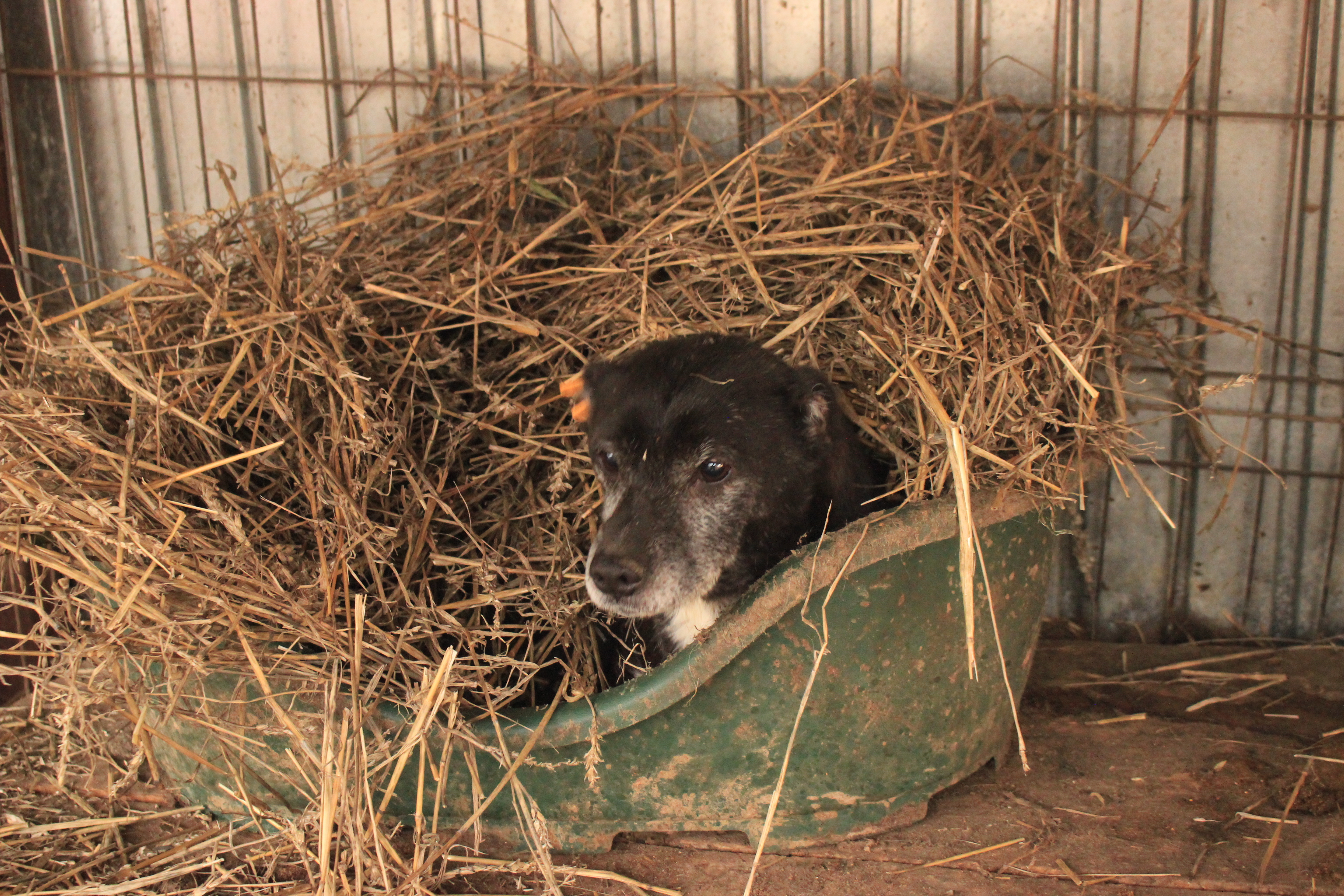 Auch die Kennels 2-11 sind nun alle mit Stroh versorgt, wir konnten einzelne Notfälle erfassen und müssen morgen 3 Hunde Tierärztin Catlina vorstellen, darunter auch ein alter Rüde, der viel zu dünn ist. Diesen haben wir aber erst spät am Nachmittag entdeckt, Catalina war nicht mehr vor Ort. Beim Strohverteilen sind die Hunde immer sehr aufgeregt, so viel Neues passiert hier nicht sehr oft. Das Stroh riecht sehr spannend und die neuen Liegemöglichkeiten werden sofort okkupiert. Ich hatte ein wenig Stroh auf einer Hütte zwischen geparkt, um es nicht in den Matsch legen zu müssen. Als ich zwei Minuten später wieder aufstand, hatte sich dort eine nette schwarze Hündin schon ein Bettchen gebaut und war völlig zufrieden mit sich und der Welt. Was für ein Bild, traurig und schön zu gleich. Wunderbar, dass wir dieser Lady so eine Freude machen konnten. Traurig, dass die Hunde mit so einer Kleinigkeit schon zu glücklich sein können. Ein loser Berg Stroh auf einer Holzhütte ist hier schon eine Steigerung vom Lebensstandard.