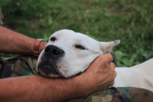 Die Begegnung mit Dogo-Cane Corso Mix Hündin MAROSLELE hat uns sehr berührt. Ihre Ohren sind brutal abgeschnitten, das Gesäuge hängt tief. Sie wurde klar als Zuchtmaschine missbraucht…Mishu hat sie ausgesetzt am Friedhof gefunden, nur Haut und Knochen, die Haut kaputt von den vielen Flohbissen. Jetzt kann sie hier erst mal ein wenig Kraft tanken. MAROSLELE ist wirklich ein Schatz. Gutmütig, ruhig, verträglich, anhänglich…. Es ist tragisch, was sie alles schon erlebt hat, aber wir sorgen uns darum, dass es für sie endlich besser wird…