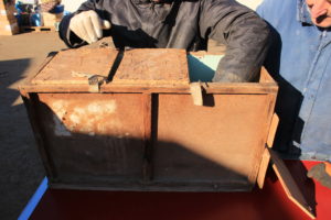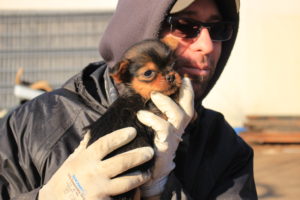 Als Emil – einer der Fahrer – den Wagen gerade vom Hof fuhr, kam der Pförtner mit einer Holzkiste…selfmade. Ausstiegen 3 kleine Yorkie Mix Welpen. Sehr nett, sehr jung…alle drei sind im Container geparkt, die erste Impfung folgt nach der Entwurmung…. Gut, dass sie die Nacht nicht noch irgendwo rumstanden, das hätte keiner gepackt…
