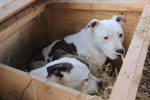 Und dann machten wir uns auf für die letzte Strohrunde. Wir haben uns schon so daran gewöhnt, wenn nachmittags das Licht schlechter wird, Kennel für Kennel mit Stroh zu befüllen. Es ist so eine gute Tat, es geht fix und man macht so vielen eine Freude. Diese beiden Staff Ladies hier haben sich zum Beispiel total gefreut. Ihre blanke Hütte war gar nicht gemütlich und auch Staffies haben keine Unterwolle…. zwei sehr tolle Mädchen, ganz lieb miteinander. Leider wird es super schwer, für sie etwas zu finden….:(