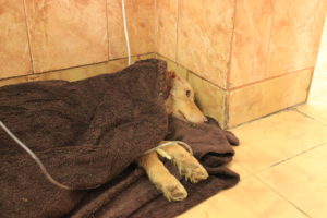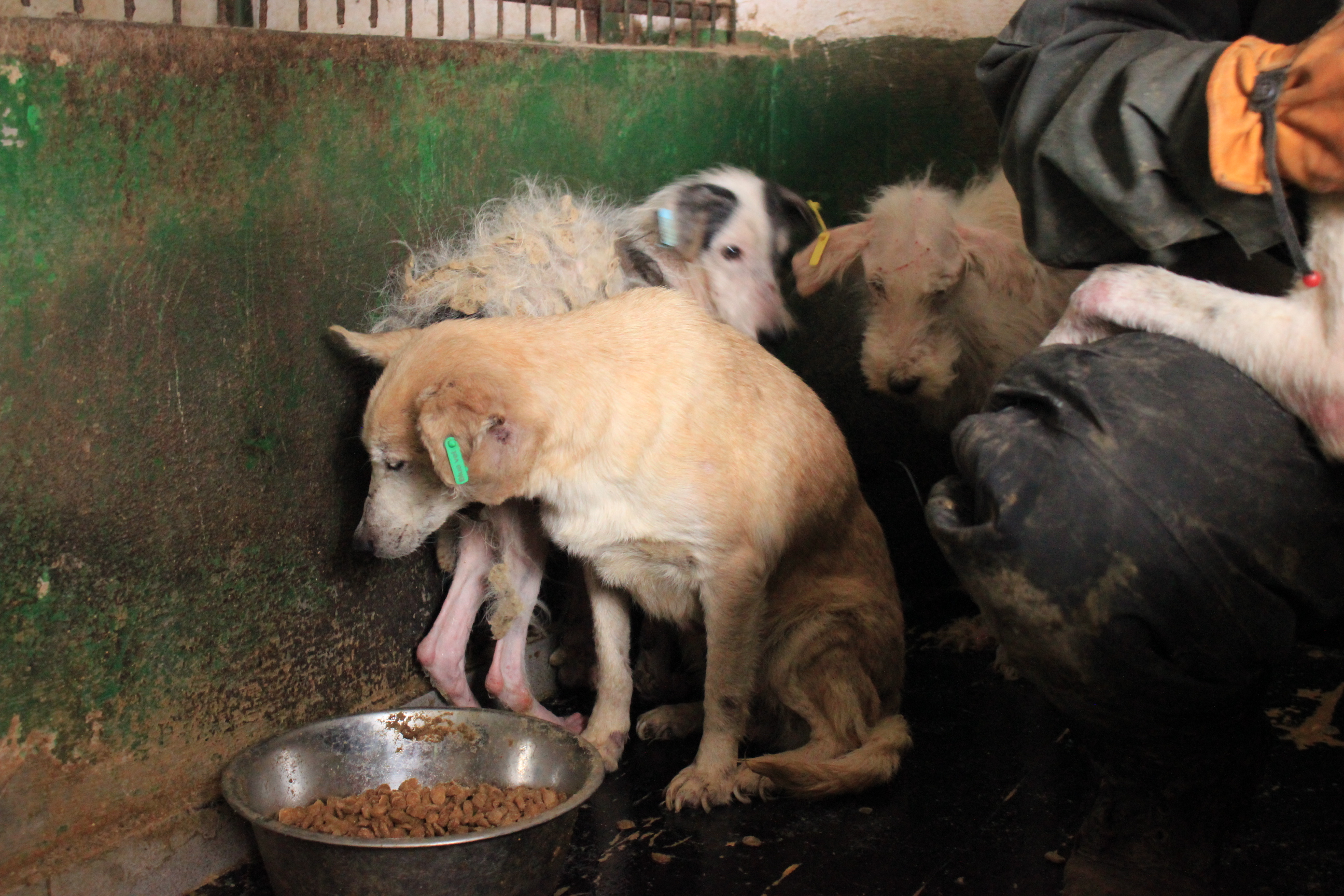 Der Morgen begann mit Erfassung in Kennel 193, als wir bemerkten, dass in den Kennels gegenüber tierisch Stress sein musste. Die Hunde waren lauter als sonst, dort in dem Bereich merkte man auch eine viel stärkere Gruppendynamik als sonst. Das bedeutet nie etwas Gutes. Florian ging vor, Schippe dabei. Ich musste die Reste vom Strohballen noch verteilen und kam dann hinterher. In dem Kennel, wo der Stress war, waren eigentlich nur sehr große Hunde, und ich wunderte mich, als ich sah, dass ein ganz kleiner Hund dort anscheinend stark verletzt wurde. Der kleine Kerl suchte zwar Schutz bei uns, aber er wollte sich nicht hochnehmen lassen, er schrie jedes Mal gleich ganz fürchterlich und wehrte sich mit den Zähnen. Das ging so also nicht, zumal die anderen Hunde auf der Lauer lagen und nur drauf wartet, das zu Ende zu bringen, was sie eigentlich tun wollten. Ich ging schnell los und holte eine Box, damit wir den kleinen Kerl dort rausholen konnten, ebenso informierte ich Catalina. Auch sie war sehr verwundert, dass der kleine Mann in diesem Kennel war, er musste geklettert sein…