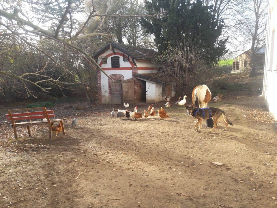 Er versteht sich mit allen gut und hat auch vor den Pferden keine Angst. Das Grundstück ist wegen allen Tieren sehr gut eingezäunt, so dass er heute zusammen mit ihnen frei rum laufen durfte.