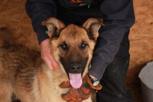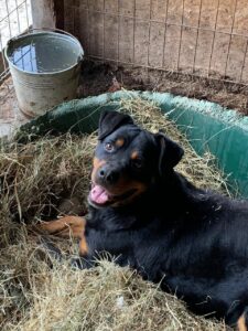 Als wir mit der gesamten Erfassung fertig waren, checkten wir noch einige Hütten, prüften, wo die Männer Anfang der Woche noch Hütten aufstellen sollten und machten uns auf zum Heulager. Denn die letzten Stunden wollten wir noch einiges an Heu in die Hütten auffüllen, vor allem bei den Hunden, die mit dem nasskalten Wetter wirklich Probleme haben. Das sind vor allem die Welpen, aber auch die Oldies und die Hunde mit kurzem Fell. Gerade die Staffis und unser Rotti Georg. Er hat uns so gerührt…sein einziger Besitz ist ein kleiner runder Stein, den er durch die Gegend trägt. Ihn hat er direkt mit in sein Heubett gelegt. Herzzerreißend. Leider ist Georg ziemlich kaputt gemacht worden, wir wissen nicht, wie seine Vorgeschichte war. Er hasst andere Hunde und ist auch mit dem Menschen nicht einfach. Man kann zu ihm rein, aber fasst man ihn zu lange an, wird er sehr spannig und wir wollen nicht so ganz wissen, was dann der nächste Schritt ist. Wir müssen hier schauen, wie er sich entwickeln wird, er ist noch nicht all zu lange da. Und wir haben euch ja auch berichtet: Viele Hunde entwickeln sich hier wirklich zum Positiven, wenn sie einfach tägliche nette Menschen erleben, die ihnen begegnen und sich um sie kümmern. Für die sie nicht lästiger Abfall sind, der in der Ecke herumsteht.