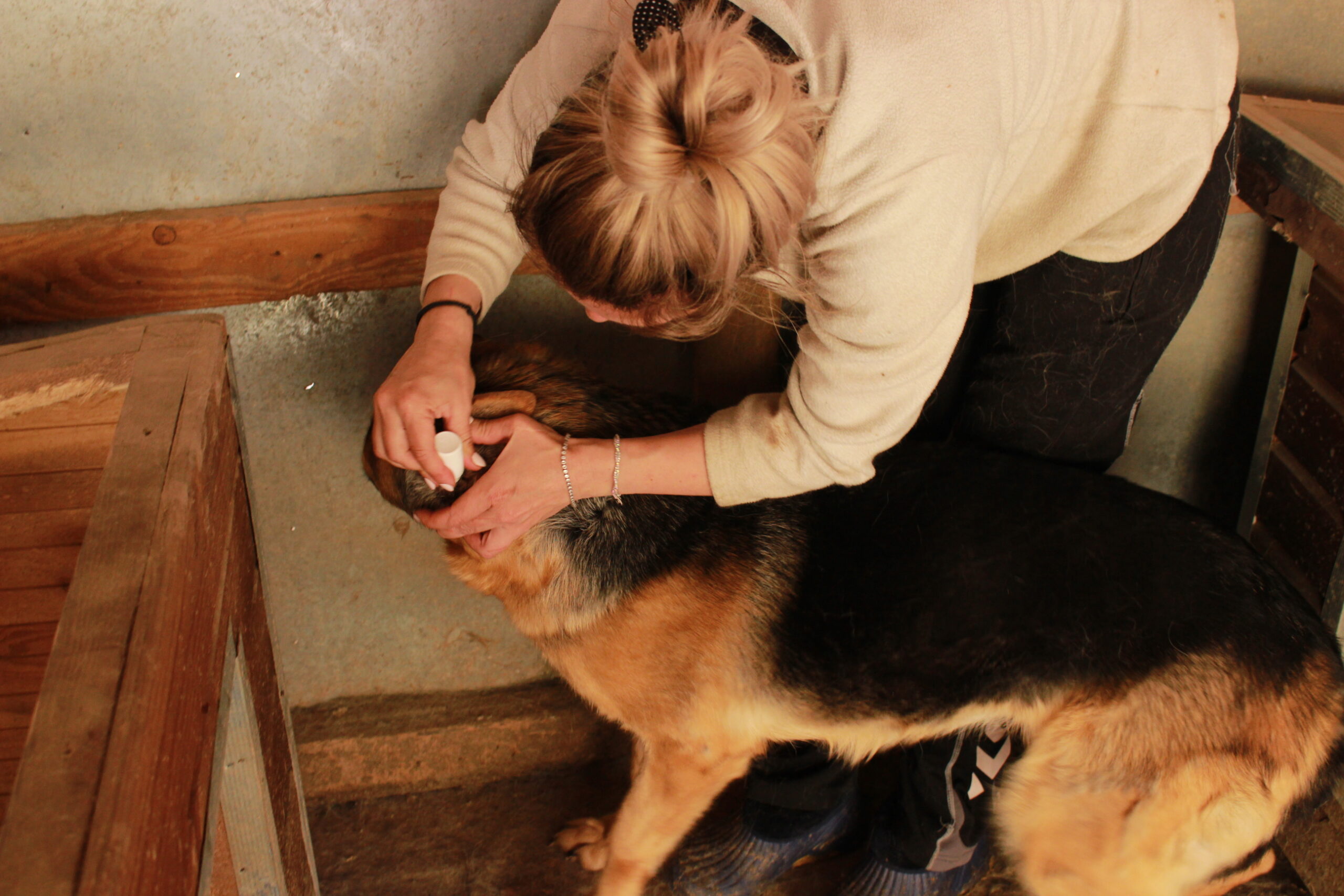 LORA in den C-Kennels hat eine ganz fiese Ohrenentzündung und Andreea hat sie heute behandelt, sie hat schlimm geweint, aber morgen sollte es besser werden: