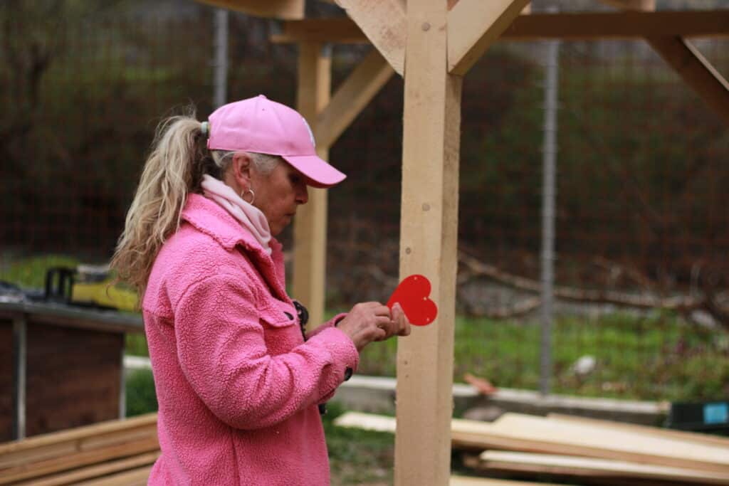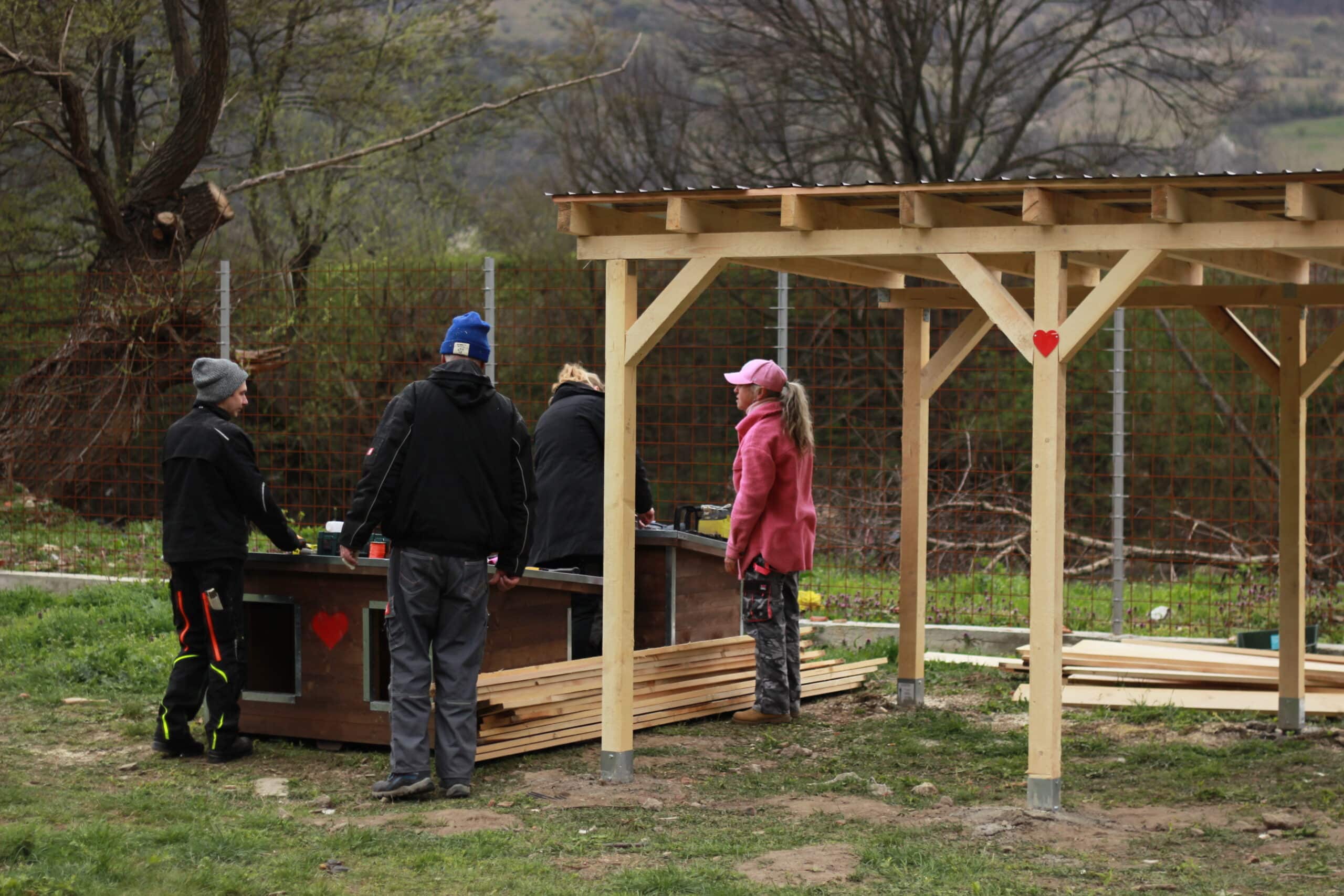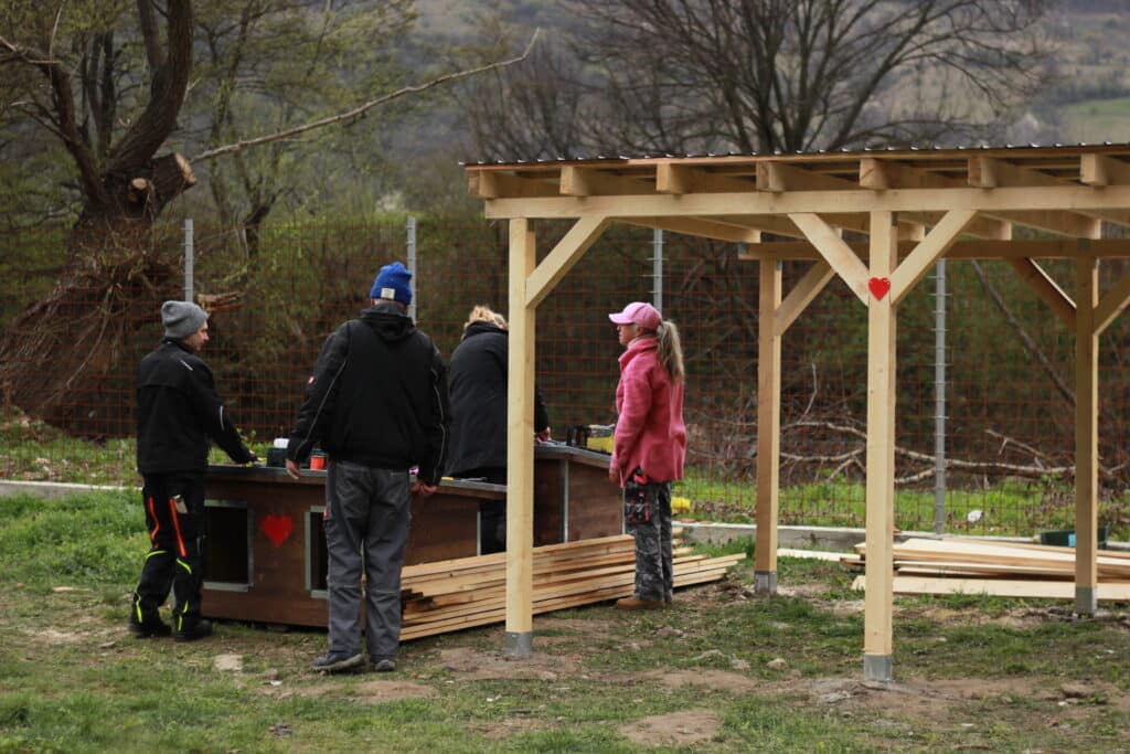 Später bin ich noch zum Open Shelter gefahren, um zu schauen, was das Baurudel auf die Beine gestellt hat und der Fortschritt war schon von Weitem zu sehen! 2 Carports waren komplett fertig, einer noch halb offen, dieser wird heute verbrettert… Was für eine tolle Arbeit, was für ein gutes Team, das ganz strukturiert, klar und ruhig seinen Plan verfolgt. Heute kommen dann die Hütten zum Open Shelter und werden unter die Carports platziert, damit die Hunde dort Ruhe- / Schutzzonen haben. Jeder Carport hat ein kleines Herzchen bekommen – was für ein schönes Zeichen.