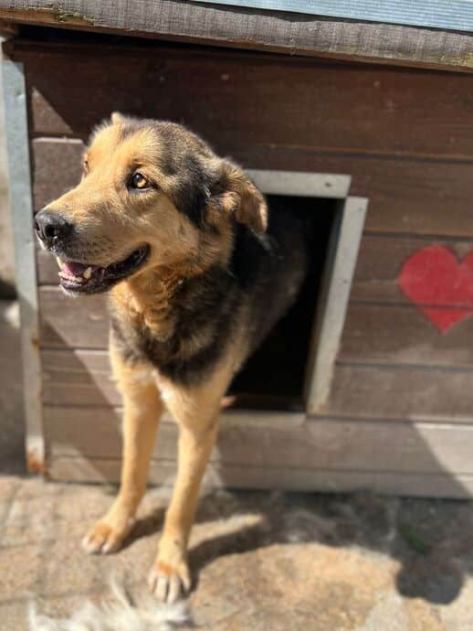 ACE teilt sich seinen Kennel mit einem dominanten Rüden, das Zusammenleben ist schwierig: ACE zieht sich stark zurück, liegt meist in seiner Hütte und traut sich kaum heraus. Die ständige Anspannung und die häufigen Konflikte setzen ihm sichtlich zu. Bei unserem Besuch konnten wir den Kennel nicht betreten und haben ihn nur von außen beobachtet. ACE blieb dabei im Hintergrund, verunsichert und überfordert vom Stress in seiner Umgebung.