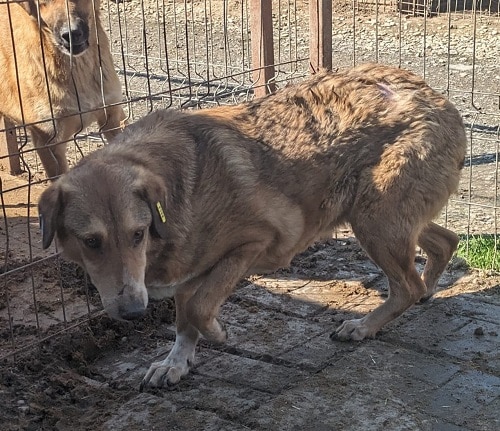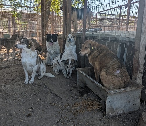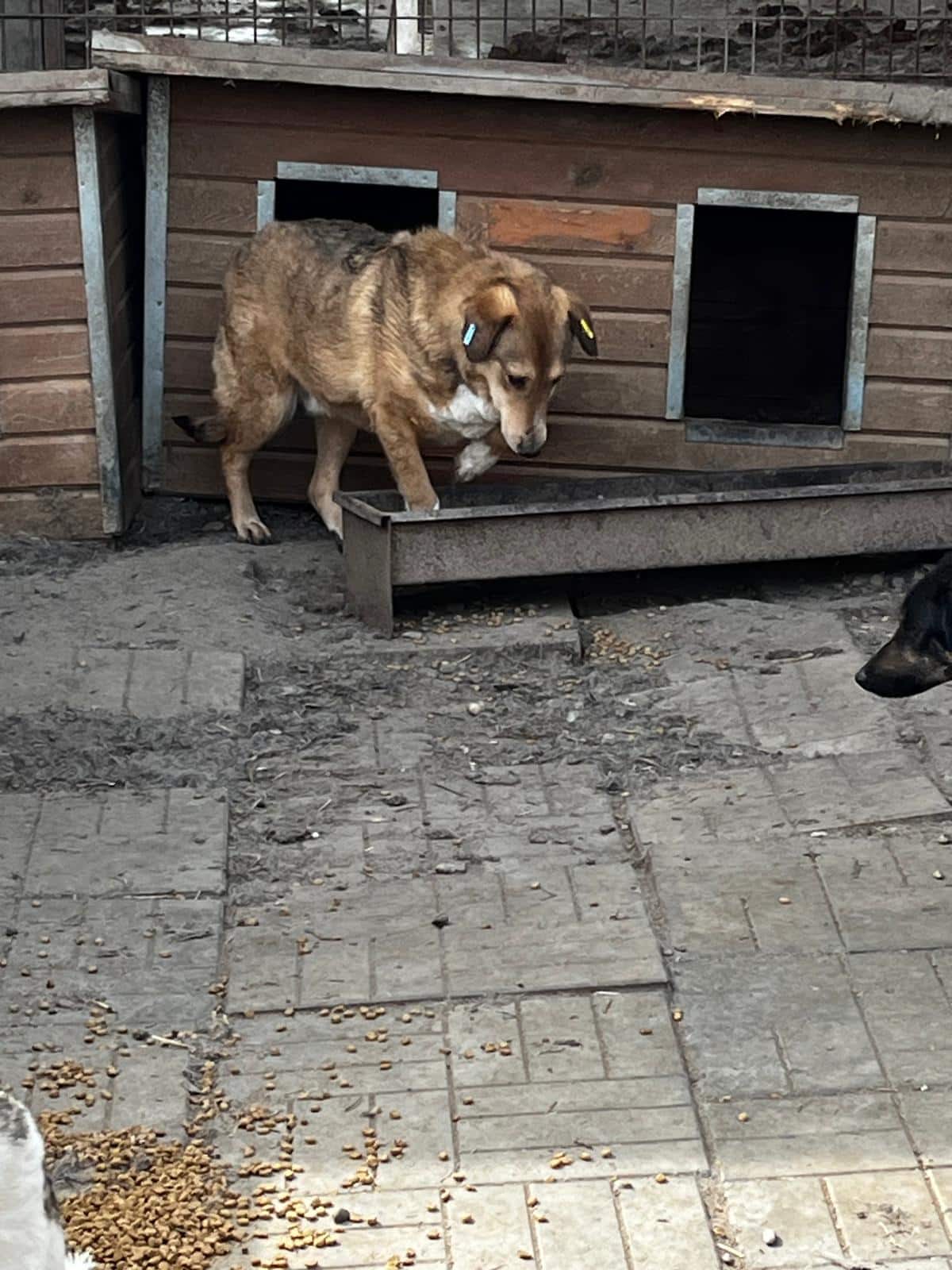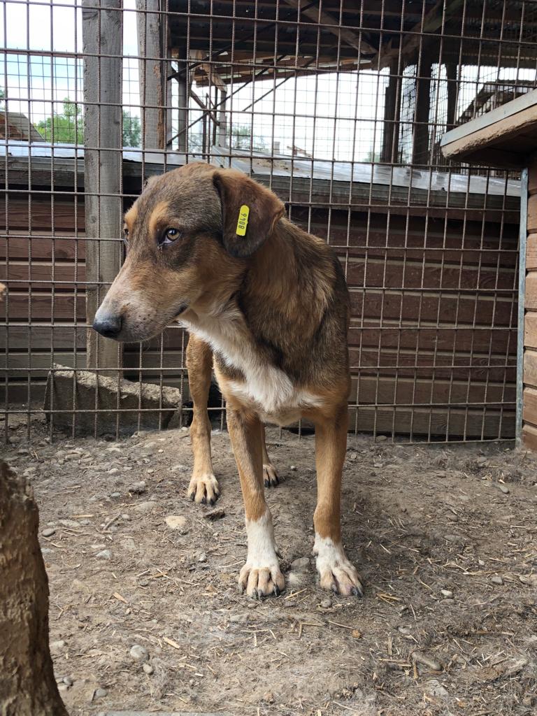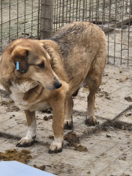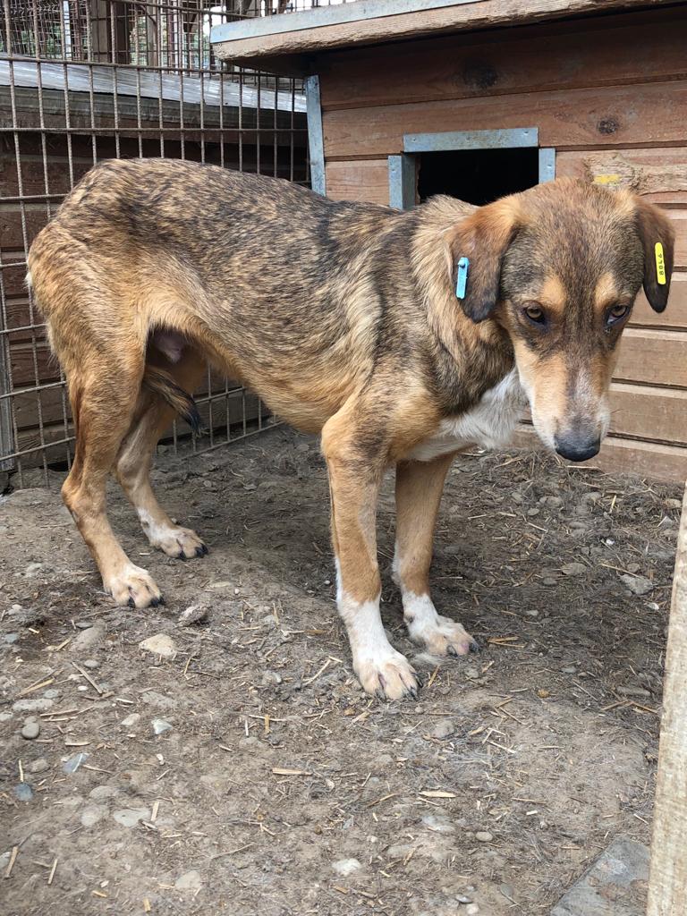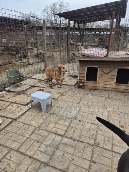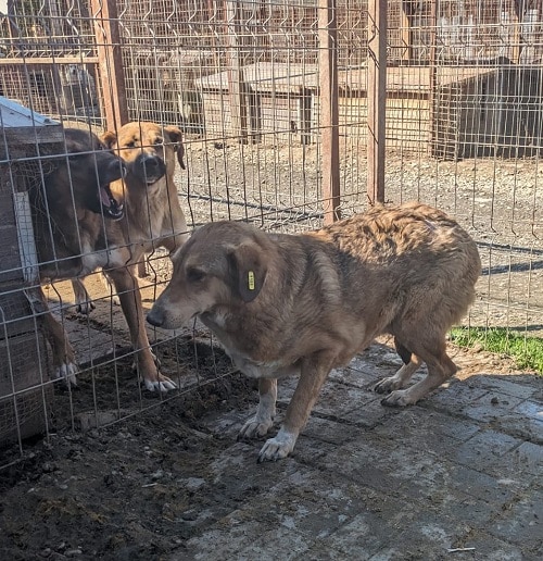 Adriano ist ein sehr schüchterner Rüde, der sich nicht freiwillig aus seiner Hütte traute. Als wir ihn vorsichtig heraus bewegten, wurde deutlich, wie eingeschüchtert er – ebenso wie andere Hunde in seinem Kennel – von der Umgebung ist. Sobald sich die Hunde in diesem Kennel außerhalb der Hütte aufhielten, wurden sie von den Hunden in den drei angrenzenden Kenneln immer wieder verbellt und bedrängt. Diese ständige Konfrontation sorgt für großen Stress und Unsicherheit. Innerhalb seiner eigenen Hundegruppe zeigt sich Adriano verträglich und unauffällig.