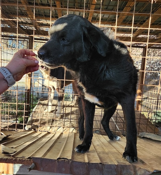 AJAN sitzt mittlerweile alleine im Kennel und begegnete uns ruhig und besonnen. Dankbar und ohne jegliche Hektik nahm er die angebotenen Leckerchen an. Die Streicheleinheiten genoss AJAN sichtlich.