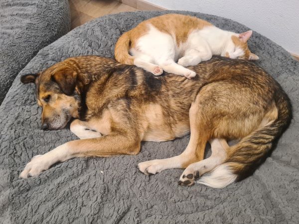 AKAI lebte 5 Jahre im rumänischen Tierheim seine Pfote wurde irgendwann gequetscht und ist entsprechend schlecht zusammengewachsen, leider ist diese auch durchtrittig und die Kralle wächst spiralförmig. Wir haben sie stark kürzen lassen von unserer Tierärztin sodass er damit trotzdem gut und ausgiebig laufen kann. Er hatte eine starke Ohrenentzündung aus Rumänien mitgebracht, diese haben wir inzwischen auch operativ sehr gut in den Griff bekommen und es keine weitere Behandlung nötig. Sein Auge hatte auch etwas abbekommen, dieses hatte eine alte Verletzung und rieb auf dem Augapfel, durch eine Korrektur beim Tierarzt, hat er auch hier keine Schmerzen mehr und es ist sehr gut verheilt und sieht gut aus. Wir haben vor der OP einen Herzultraschall machen lassen, dieses pumpt sehr gut und zuverlässig ohne Auffälligkeiten. Wir vermuten das er eher jünger ist als die angegeben 12 Jahre. Ich schätze er hat seine Zähne aus lauter Verzweiflung an den Steinen und Gittern in Rumänien ruiniert. Diese haben wir auch beim Tierarzt so gut wie möglich machen lassen, er isst gerne Natursnacks (Rinderohren, Hasenohren usw) und hat dabei keinerlei Probleme beim Fressen.
