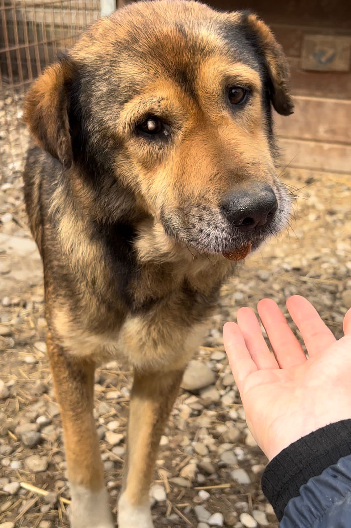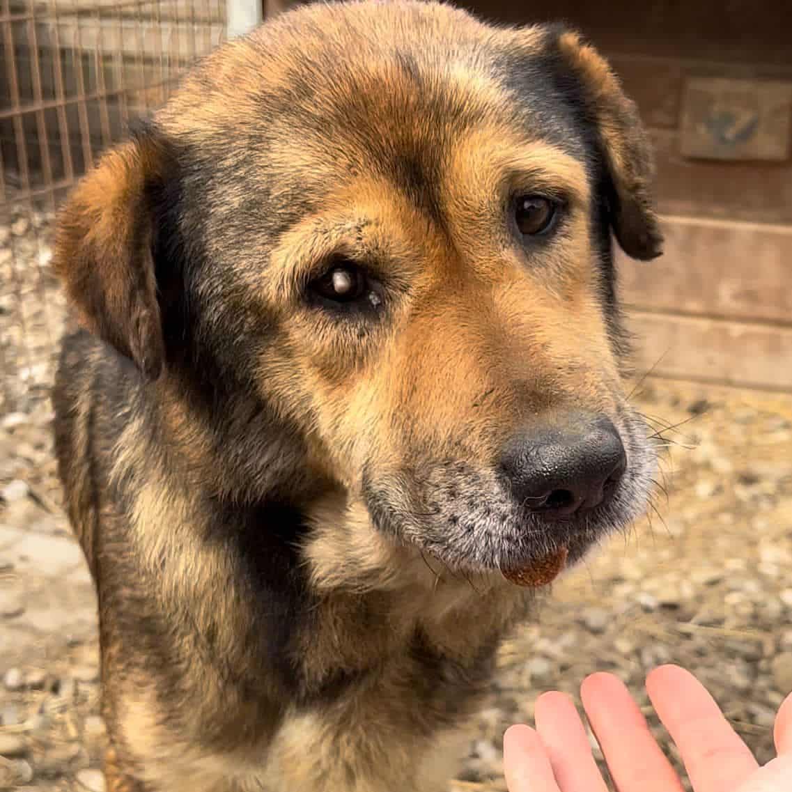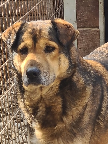 AKAI ist ein freundlicher und eher zurückhaltender Rüde. Bei unserem Besuch hatte der liebe Kerl eine Zecke über dem Auge sitzen, daher hat er extra Zeckenmittel erhalten. Uns gegenüber zeigte er sich trotzdem neugierig, nahm Leckerlies aus der Hand und ließ sich dabei vorsichtig an der Schnauze streicheln. Wir mussten außerdem erneut die Krallen an der deformierten Pfote schneiden. Nachdem wir ihn fixiert hatten, hat er es gut mitgemacht, er war in keinem Moment nach vorne gerichtet, sondern immer passiv. Genießen konnte er die ungewohnte Nähe noch nicht. Mit viel Zeit, Geduld und Einfühlungsvermögen wird auch hoffentlich bald dieser Langzeitinsasse seinem einsamen Kennel verlassen und ein eigenes Körbchen bei einer Familie finden. AKAI sitzt momentan alleine in einem Kennel.