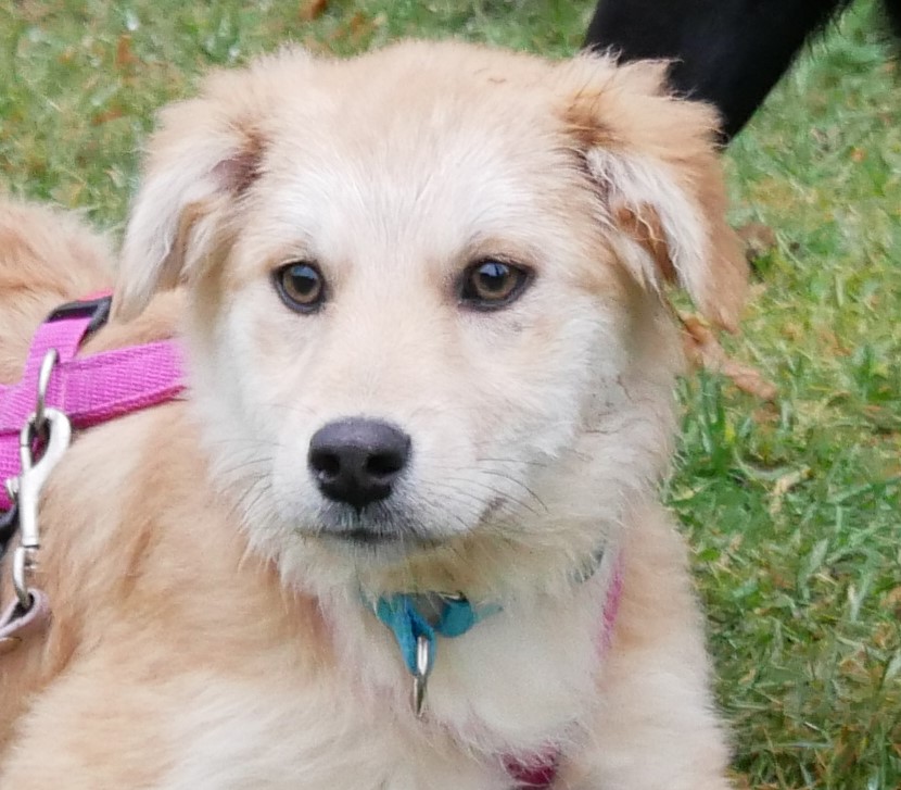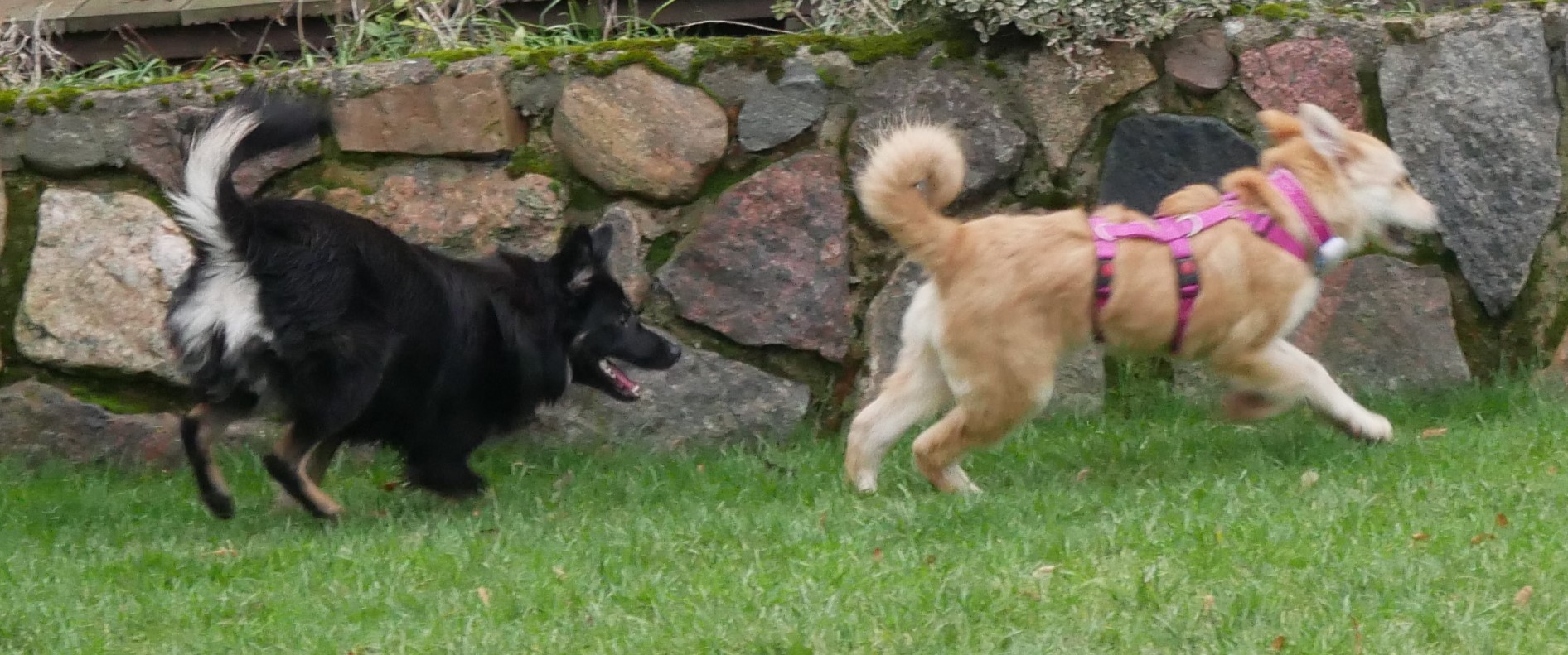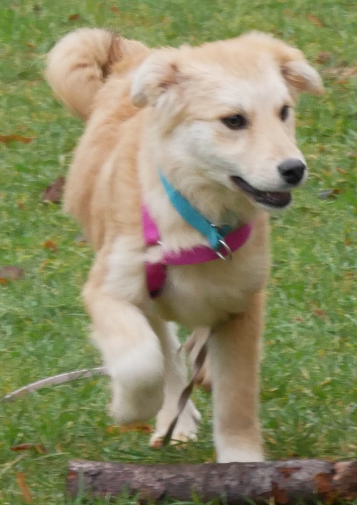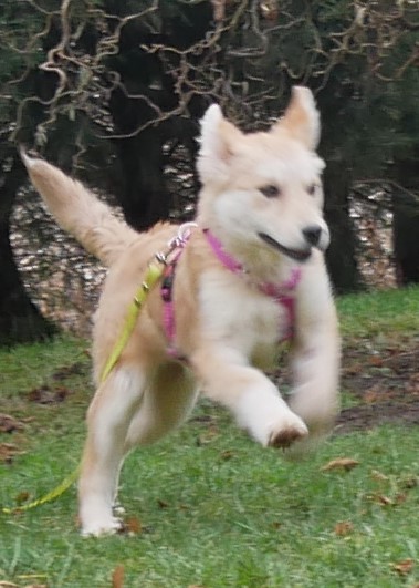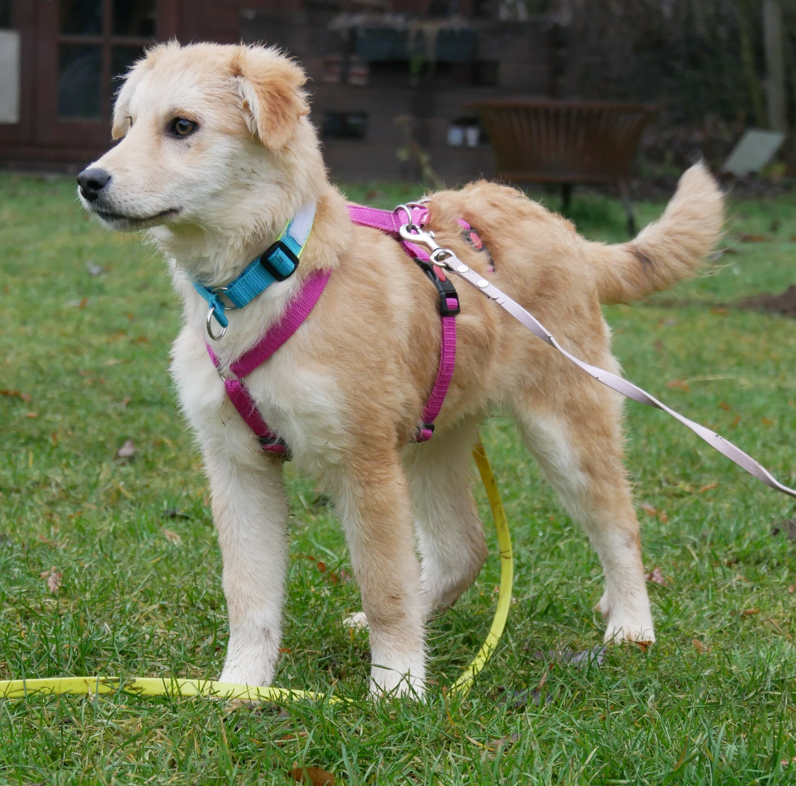 Hier bei uns auf Pflegestelle läuft sie inzwischen unbefangen und fröhlich mit. Sie bewegt sich frei zwischen drinnen und draußen, kommt, wenn man sie ruft, lässt sich das Geschirr anziehen, geht mit vom Hof und Gassi. An der langen Schleppleine klappt es auch sehr gut. Wenn sie alleine entscheiden kann, hält sie sich nahe beim Pflegestellen-Frauchen auf.