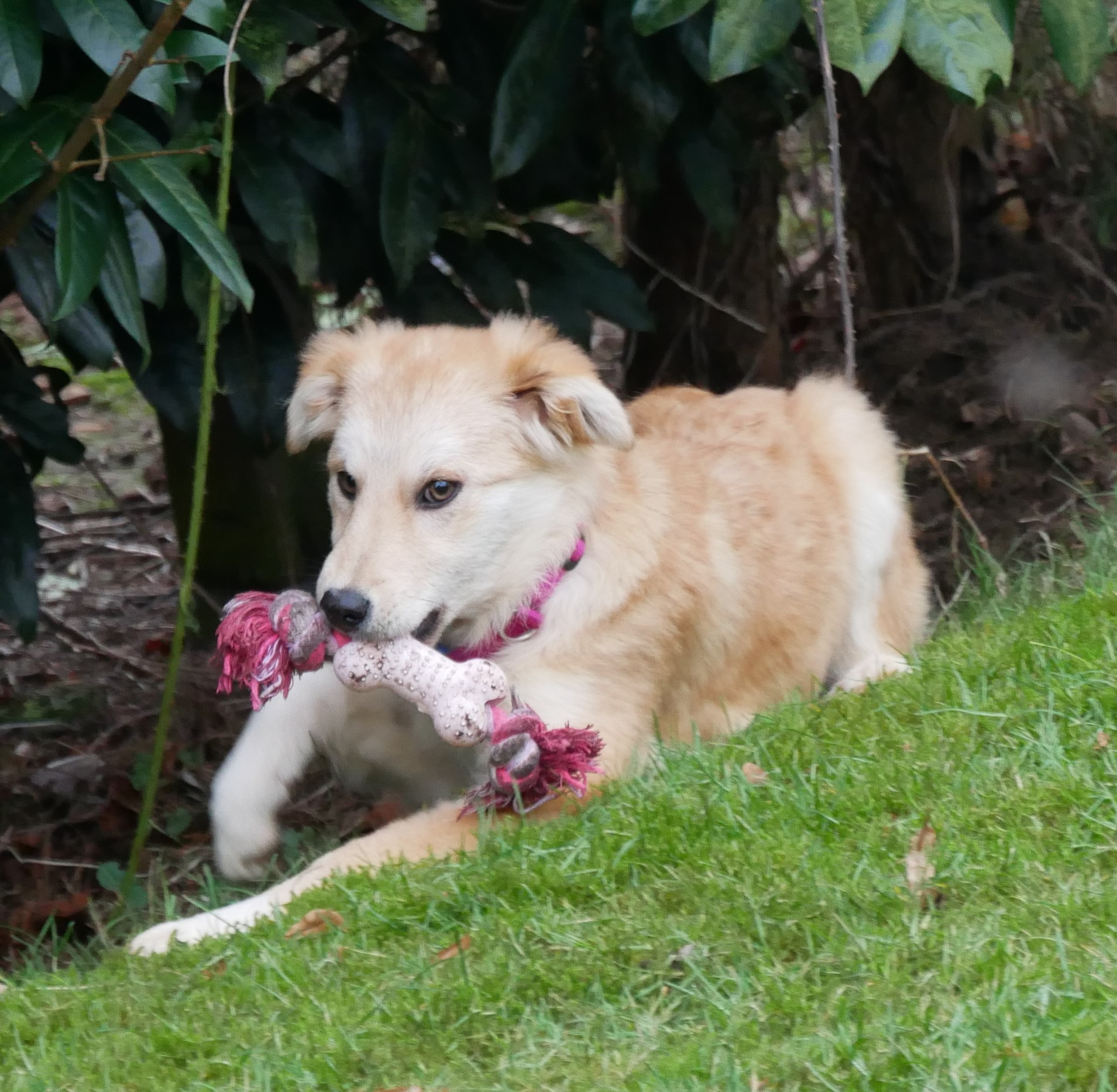 Sie lebt hier mit 4 weiteren Hündinnen und 3 hundeverständigen Katzen zusammen und kommt mit allen gut klar. Von Zeit zu Zeit testet sie sich gerne aus, schaut, ob sie nicht vielleicht mal Oberhand bekommen könnte. Kann sie nicht; die Ansagen der anderen Hunde sind klar und werden von ihr auch zeitnah akzeptiert. Und dann kann das nette Spiel, das freundliche Balgen weitergehen.