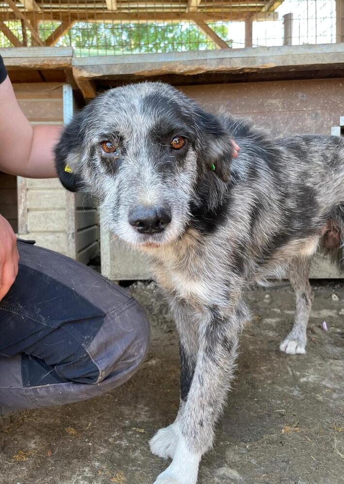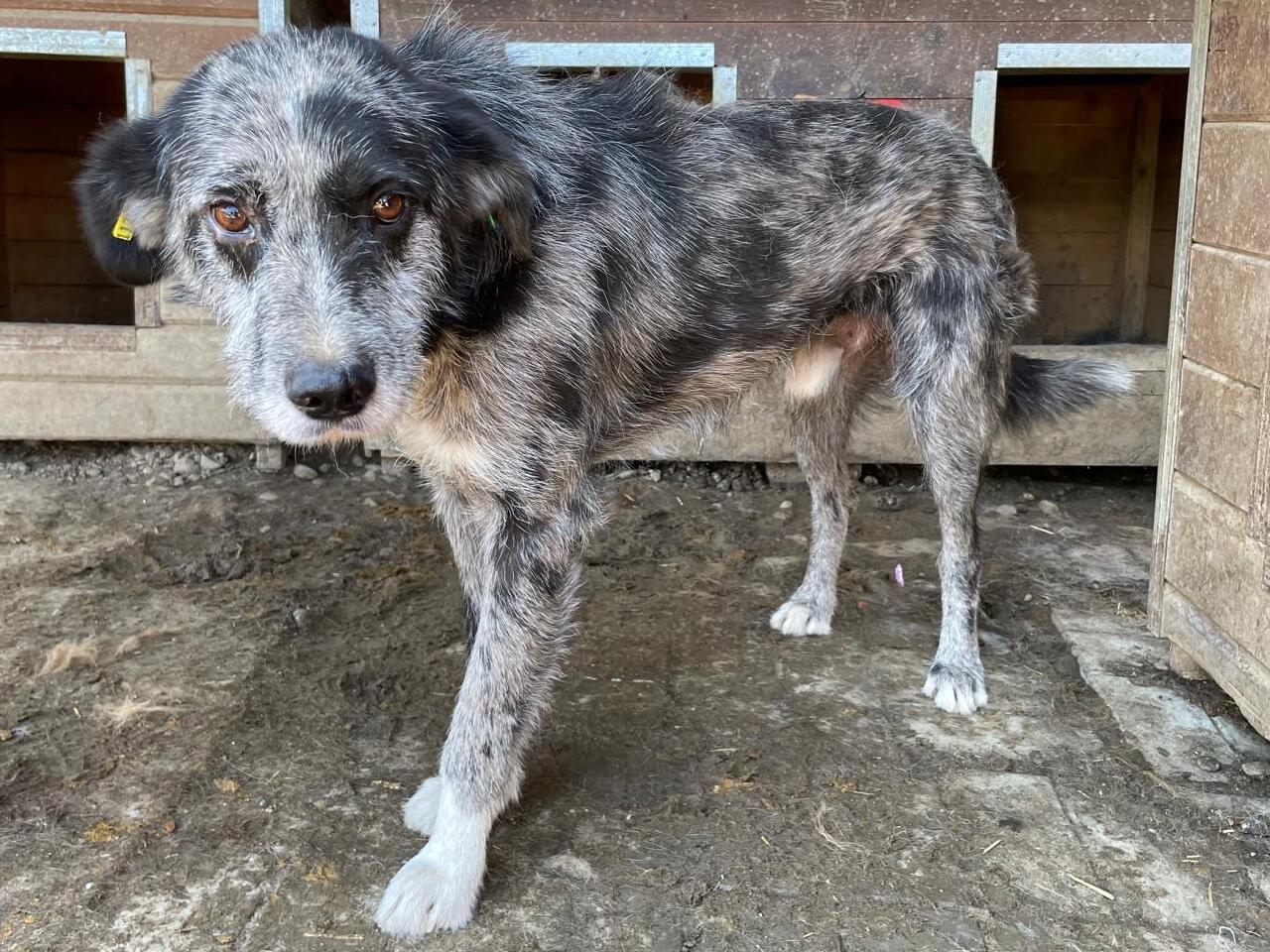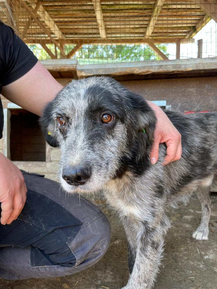 ALADIN lag während unserer Anwesenheit zunächst nur in der Hütte und beobachtete von dort aus das Geschehen. Als wir uns ihm zuwandten reagierte er interessiert und neugierig. ALADIN nahm gern Leckerli aus der Hand und ließ sich streicheln. Als wir uns abwandten kam er aus der Hütte, um sich noch mehr Leckerli und Streicheleinheiten abzuholen. Ein ganz sanfter Kerl, dem der Trubel im Kennel einfach zu viel ist und vermutlich von den anderen Hunden auch etwas unterdrückt wird. Zumindest wurde ALADIN von den Anderen nach kurzer Zeit wieder in die Hütte zurückgeschickt.