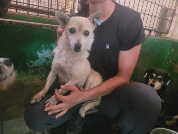Uns gegenüber zeigte sie sich ein bißchen unsicher mit zunächst halbherzigen Abschnappverhalten, was wir ignorierten. Danach war sie auf unserem Schoß und ließ sich überall streicheln. Hundesachverstand mit etwas Geduld und Ruhe wird diese süße Hündin in Windeseile überzeugen können. Hoffentlich kann diese verträgliche, sehr kleine Hündin schnell ausreisen. Das riesige Shelter Bucov ist für so einen Hund absolut kein Ort.