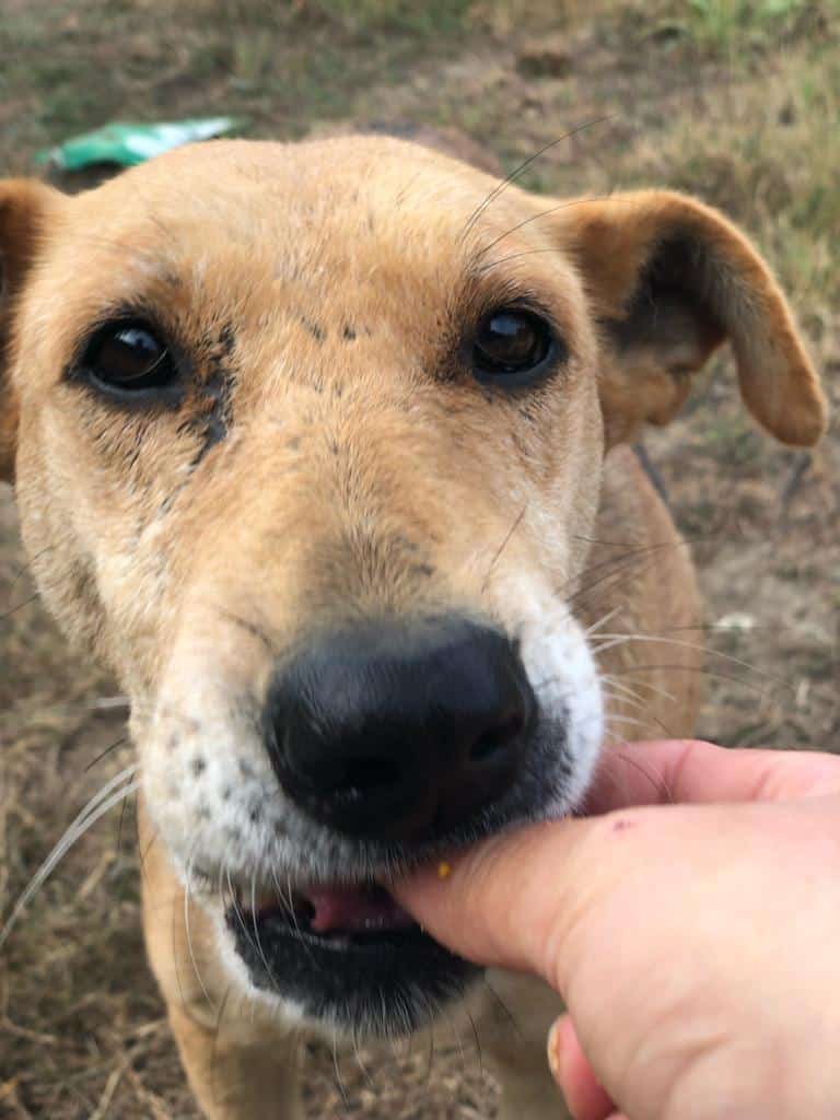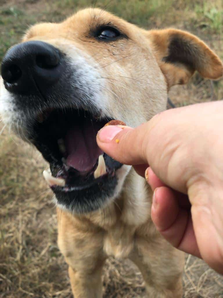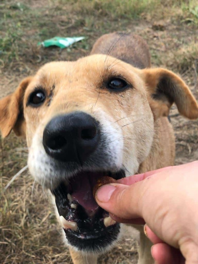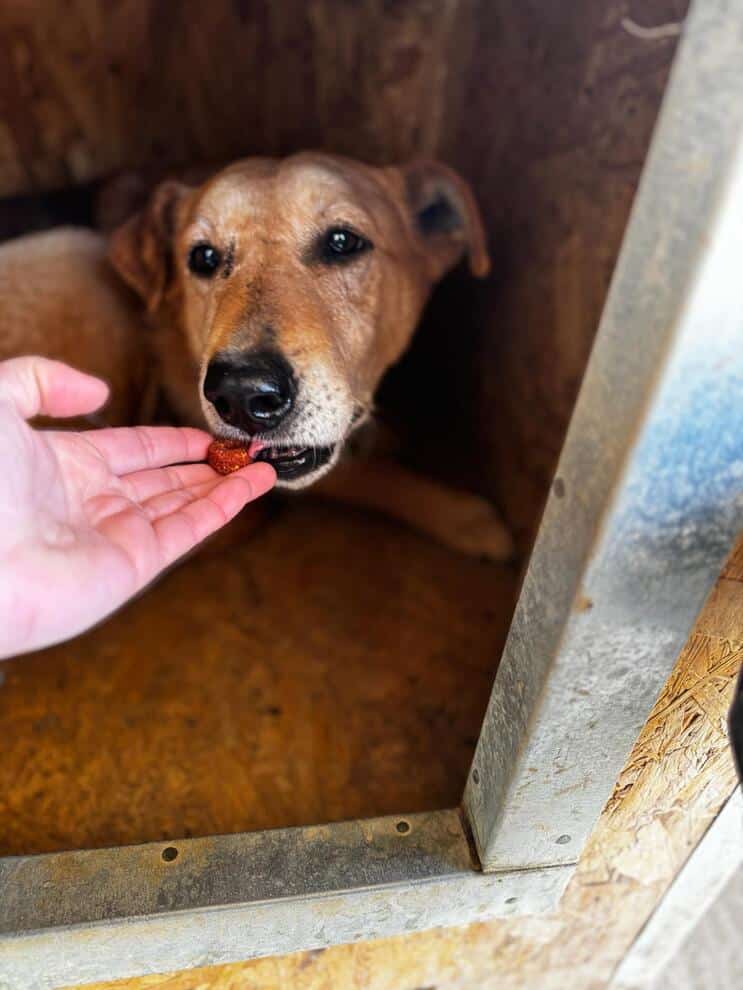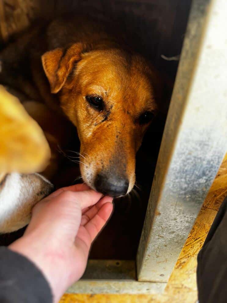 ALARA zeigte sich neugierig und interessiert. Unsere Leckerchen nahm sie gerne an. Leider sitzt die nette Hundeoma ALARA schon über ein Jahr im Shelter und der eisige Winter steht bevor.