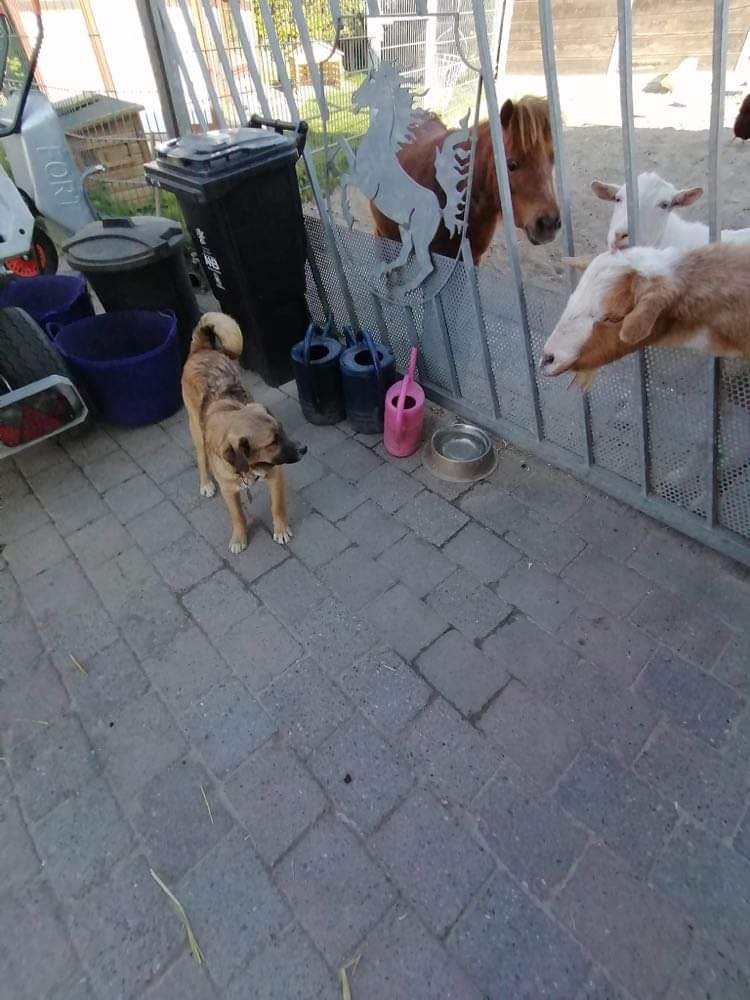 Er lebt hier in einem gemischten Rudel und er versteht sich mit allen Hunden,