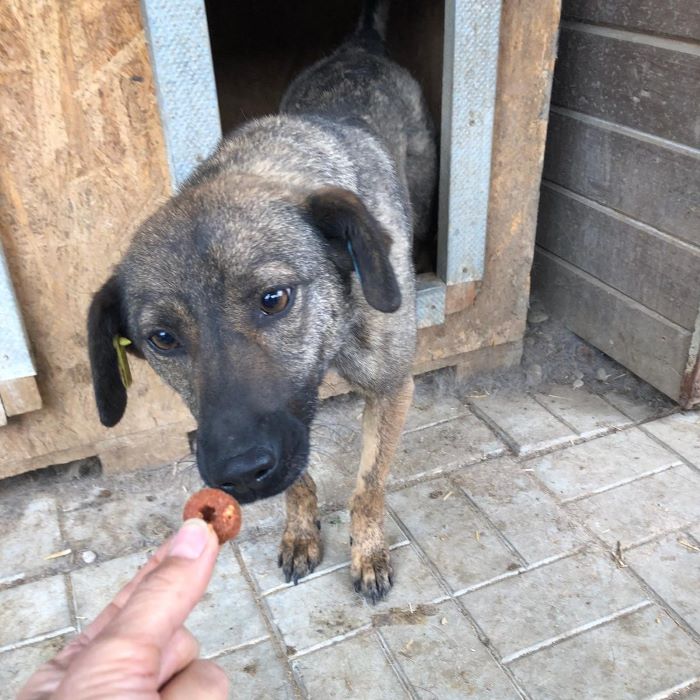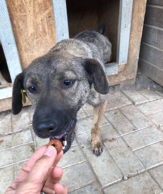 ALEXA war ganz aufgeregt über unseren Besuch und freute sich sehr. Sie ist aber zu schüchtern gewesen, um sich streicheln zu lassen. Futter nimmt sie aber gut aus der Hand. Aktuell hat sie Probleme mit ihrem linken Vorderbein, deren Ursache wir nicht kennen. Sie hält die Pfote in Schonhaltung, kann aber damit auftreten.