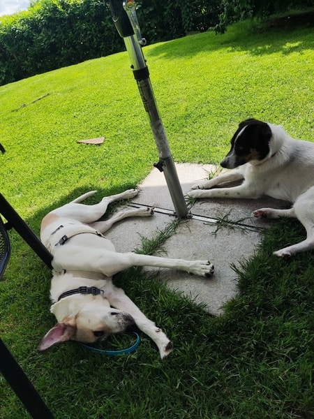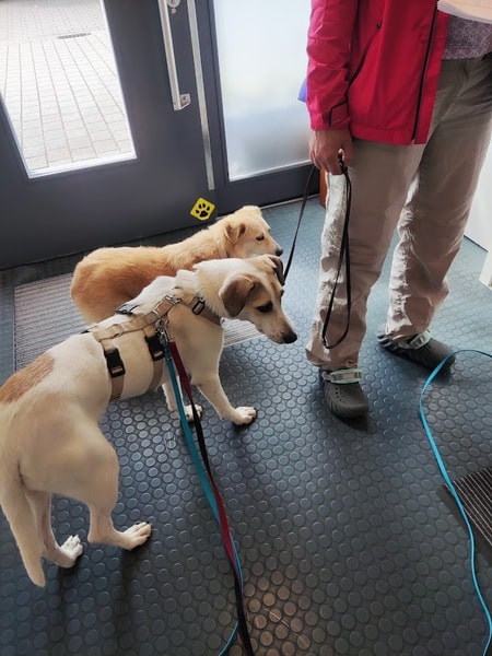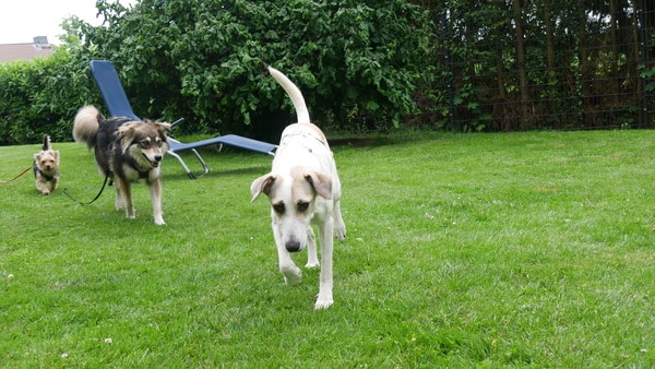 Mit dem Rudel ist sie auch absolut verträglich. Kein Gezanke, kein Resourcenverhalten, kein Futterneid. Fröhlich und lustig spielt sie die anderen Hunde an, freut sich, wenn die mitmachen. Ansagen bzw. Ablehnung versteht sie und zieht sich anstandslos zurück. Sie ist aufmerksam, verschmust, sanft und auch mal überquellend vor Freude. Im Haus kommt sie rasch zur Ruhe und legt sich einfach ab. Den ersten Home-Office Tag hat sie gut verschlafen und die erste Gassirunde hat sie prima mitgemacht; fast als wenn sie das schon immer getan hat. Sie läuft freudig mit, erspürt die Länge der Leine, nimmt ihre Umgebung aufmerksam war. Im Auto mitfahren hat sie ebenfalls problemlos gemeistert. Die hundeverständigen Katzen ignoriert sie bislang. Sie ist stubenrein, schläft nachts durch, ich kann ihr Dinge gefahrlos wieder abnehmen. Bett und Sofa sind hier tabu, auch hier scheint sie ein Vorzeigehund zu sein, und legt sich brav in die Körbchen oder bei Tisch einfach zu den Füßen hin.