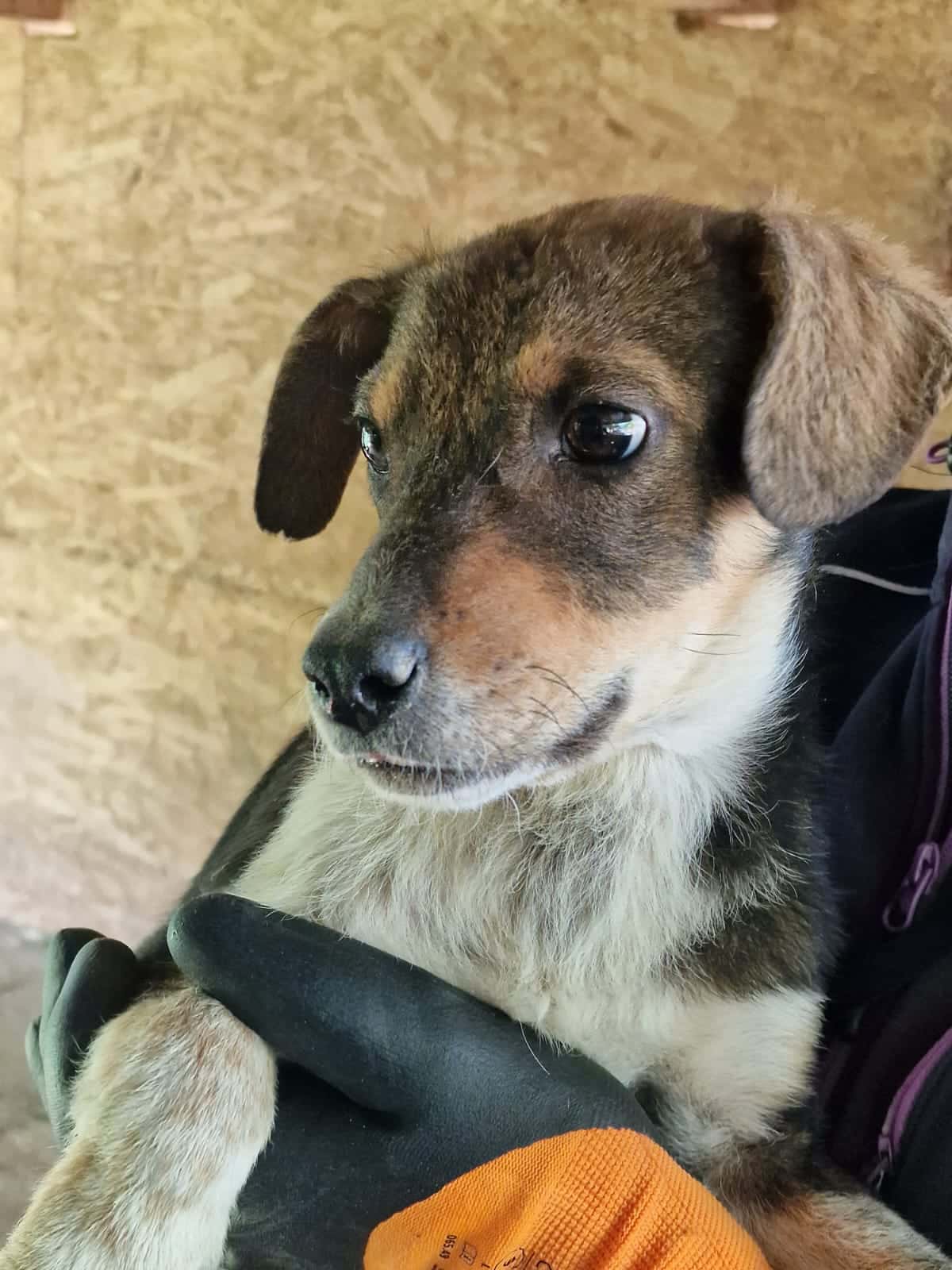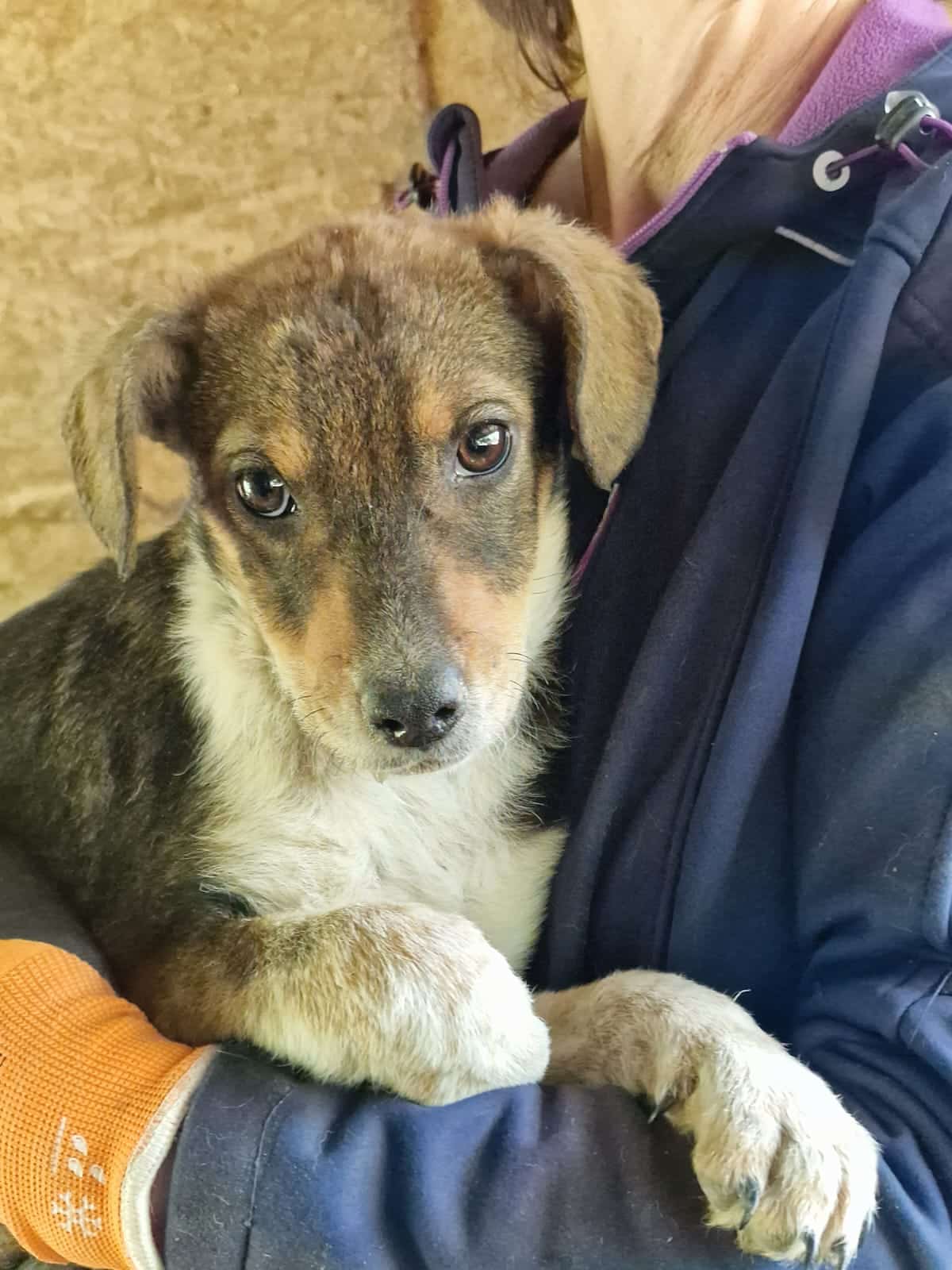 Die zurückhaltende Hündin versteckte sich zunächst hinter einer Hütte, wir konnten sie aber ohne weiteres hochnehmen. Aufgrund der Durchtrittigkeit und ihrer Schüchternheit sollte sie zeitnah ausreisen.