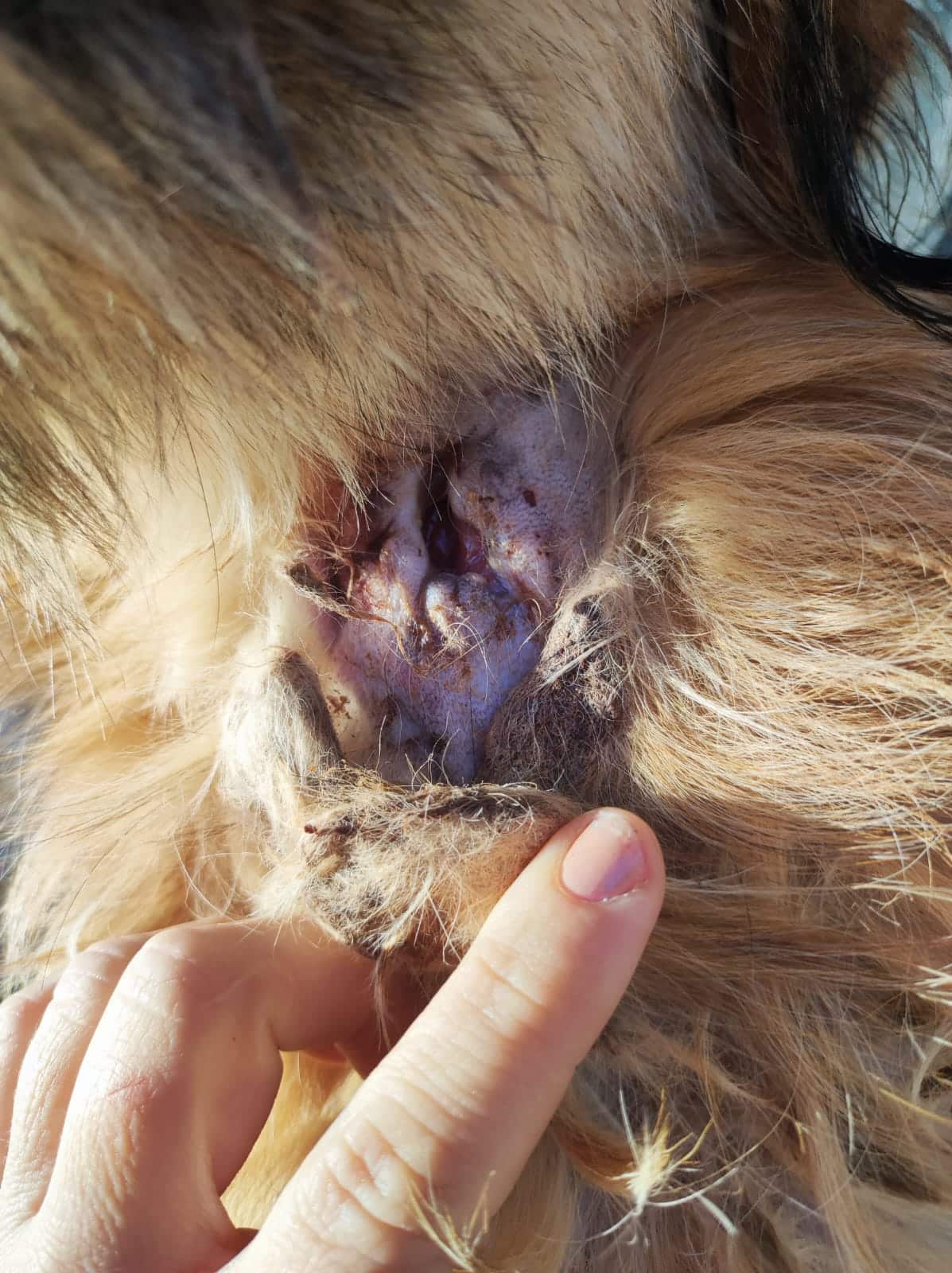 Hündin, kastriert geb. ca. 2020 Größe: ca. 50cm (Biss-)Wunde am Hals