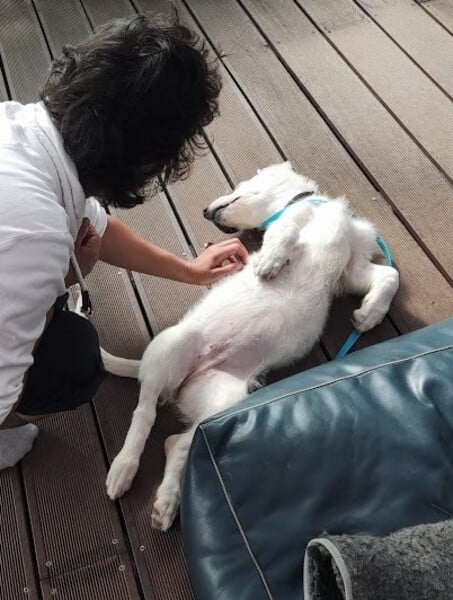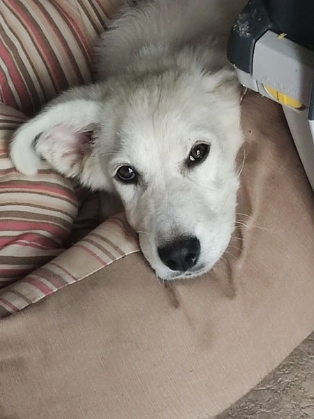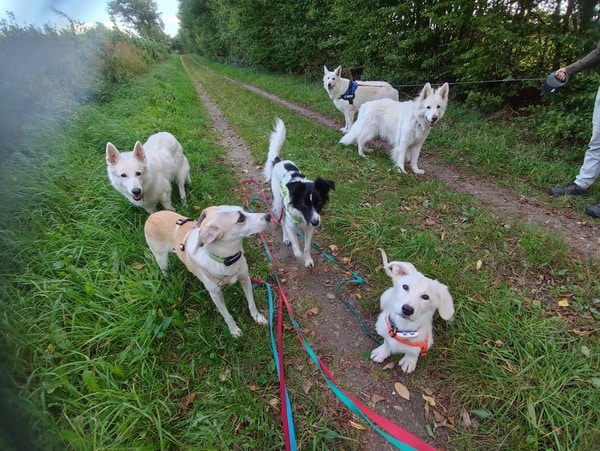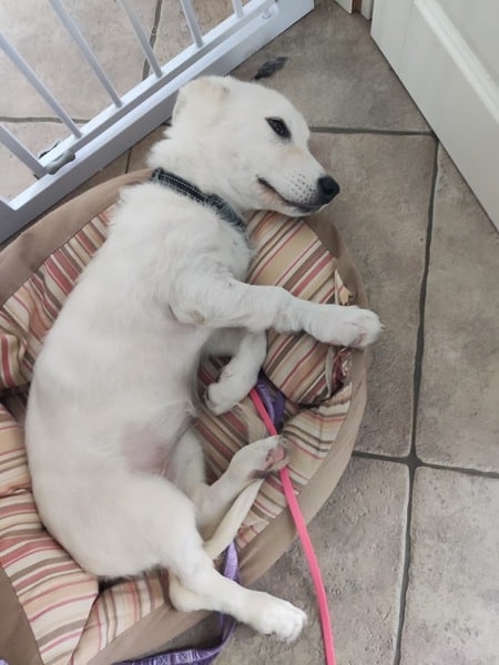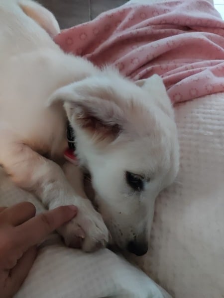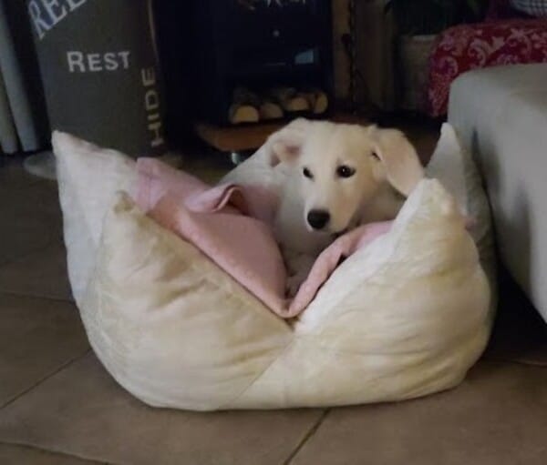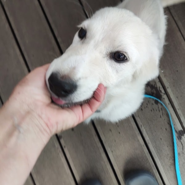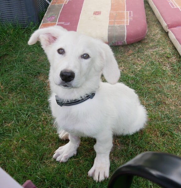Im Haus kommt Alunia schnell zur Ruhe; eine gute Voraussetzung für z.B. Begleitung ins Büro oder Home Office. Sie kennt ihren Hundeplatz, bleibt inzwischen (fast) verlässlich darauf liegen. Ich kann sie überall anfassen, Krallen schneiden, baden, Fell säubern. Sie ist den Menschen freundlich zugewandt, begrüßt diese freundlich. Gassigehen findet sie prima und macht sie schon toll. Neue Begegnung mit fremden Menschen und Hunden ist noch etwas spannig, dann wird sie aber auch hier neugierig und nimmt freundlich Kontakt auf. Bett, Sofa und Katzenfutter sind hier tabu – akzeptiert sie (meistens) auch schon ganz gut. Wenn man sie gut beobachtet und regelmäßig raus lässt, klappt es mit der Stubenreinheit gut. Nachts weckt sie mich derzeit noch 1-2 mal; kurzes Pipi, dann wird weiter geschlafen. Stadt kennt Alunia noch nicht; da sie jedoch eine recht unerschrockene Hündin ist, sollte sie das gut lernen können. Alleine bleiben muss und kann sie noch nicht, das sollte in kleinen Schritten geübt werden.