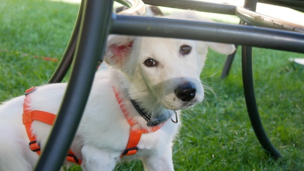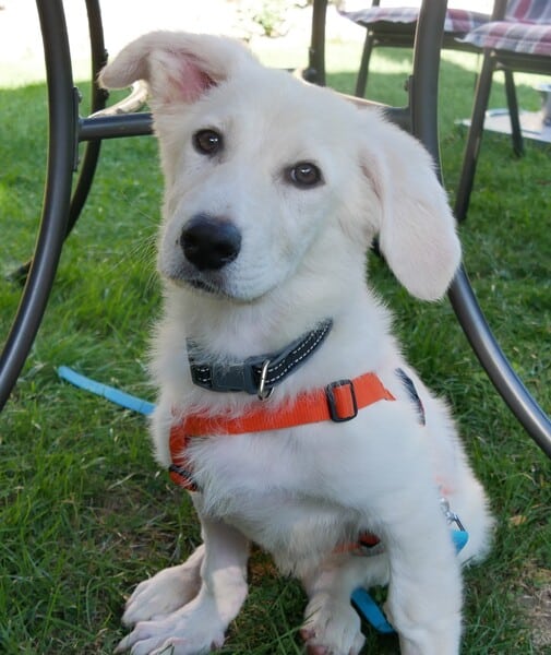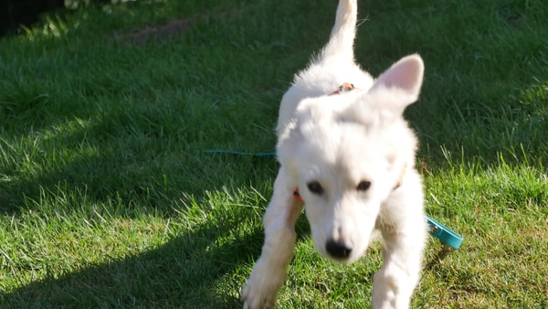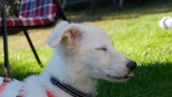 Vermutlich würde Alunia gerne eine große freundliche Wachhündin werden wollen. Tatsache ist, dass sie wohl eher eine kleine freundliche Wachhündin werden kann. Sie ist zwar noch nicht fertig mit Wachsen, aber viel dürfte da nicht mehr drin sein. Ihr weicher kleiner Körper besticht mehr durch Länge denn durch Höhe. Den weiß sie auch geschickt einzusetzen; wie ein fluffiges kleines Wattebäuschchen hüpft sie hier durch den Garten, die riesigen Schlappohren flattern hoch und runter und der ganze kleine Körper wackelt vor Freude. Eine gute Laune-Hündin ist sie – so viel ist mal sicher.