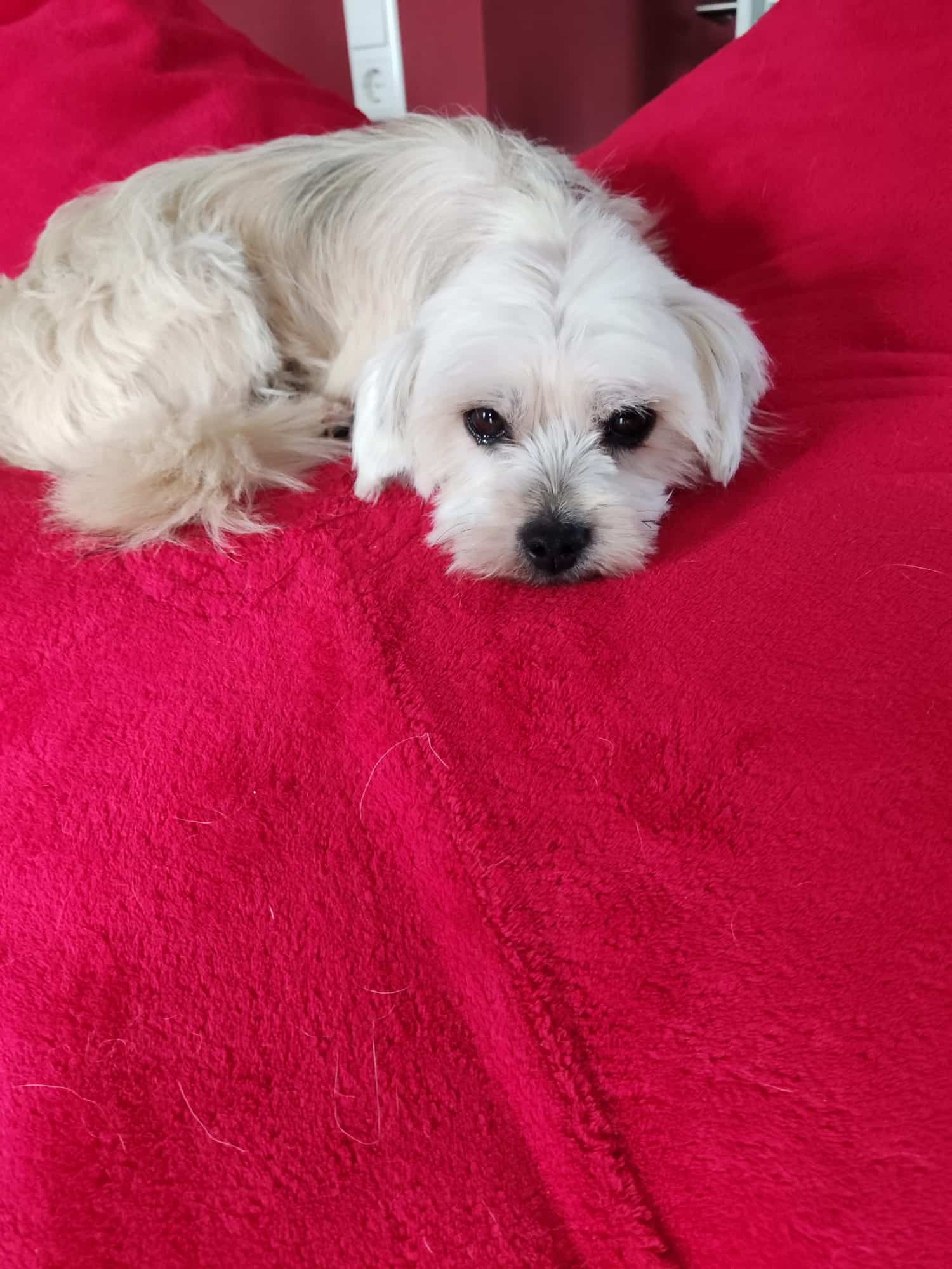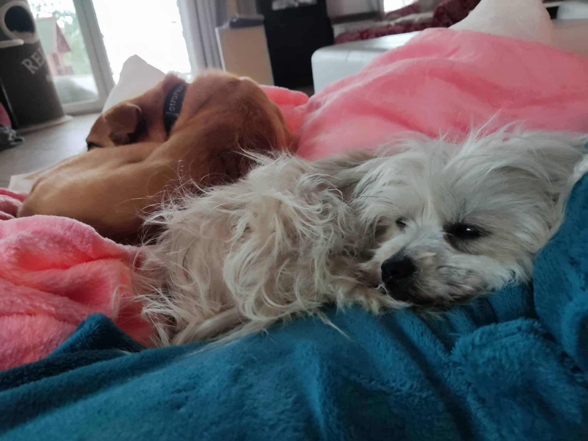 Sobald wir Zuhause zur Ruhe kommen, liegt sie gerne bei einem. Am allerliebsten gemeinsam auf dem Kronenkissen ganz eng an einen geschmiegt. Im HomeOffice tut’s dann aber auch eines der Kuschelkörbchen, hier dann sehr gerne mit einer PS-Schwester.