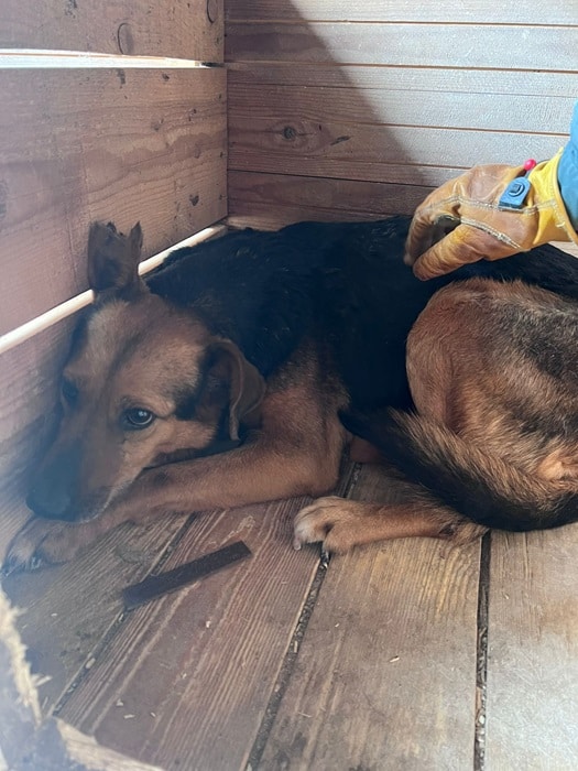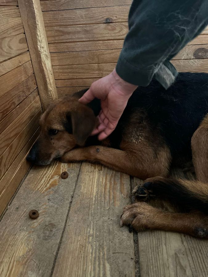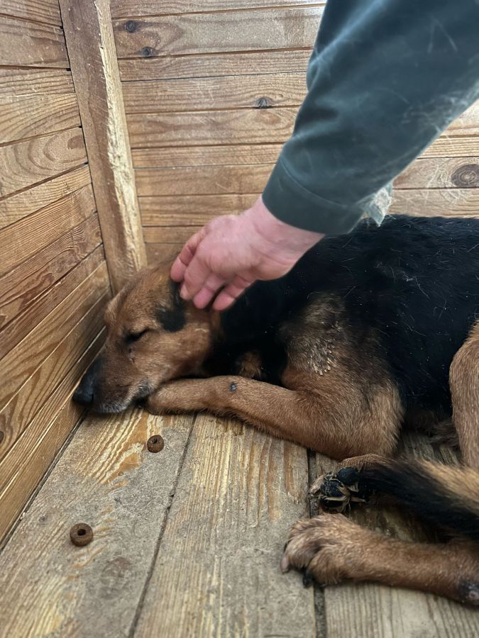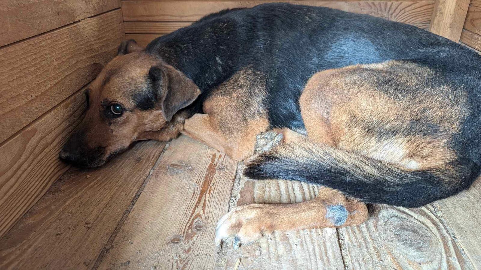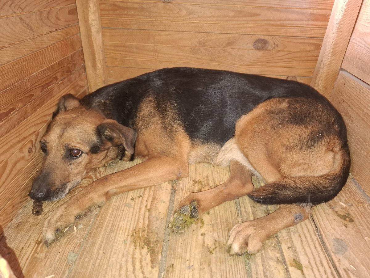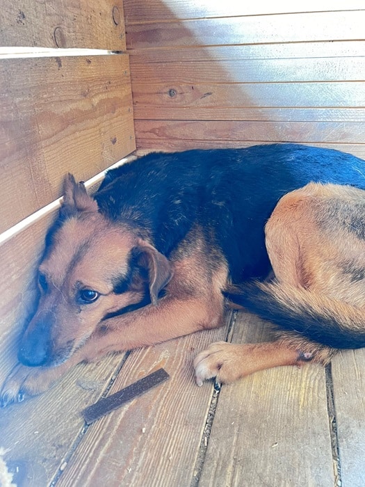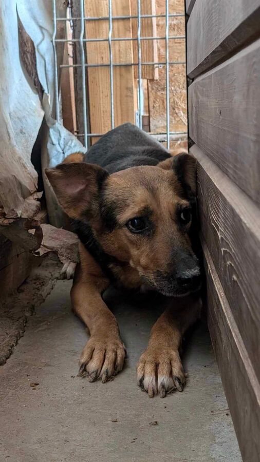 AMBER liegt nur in ihrer Hütte. Der Stress im Shelter setzt ihr weiterhin sichtbar zu, seelisch wie körperlich. Beim Streicheln haben wir gemerkt: Sie ist viel zu dünn, ihr Körper zehrt an ihren Kräften. Amber braucht dringend einen Ort der Ruhe. Einen Ort, an dem sie wieder zur Ruhe kommen, sich sicher fühlen und langsam Vertrauen fassen kann.