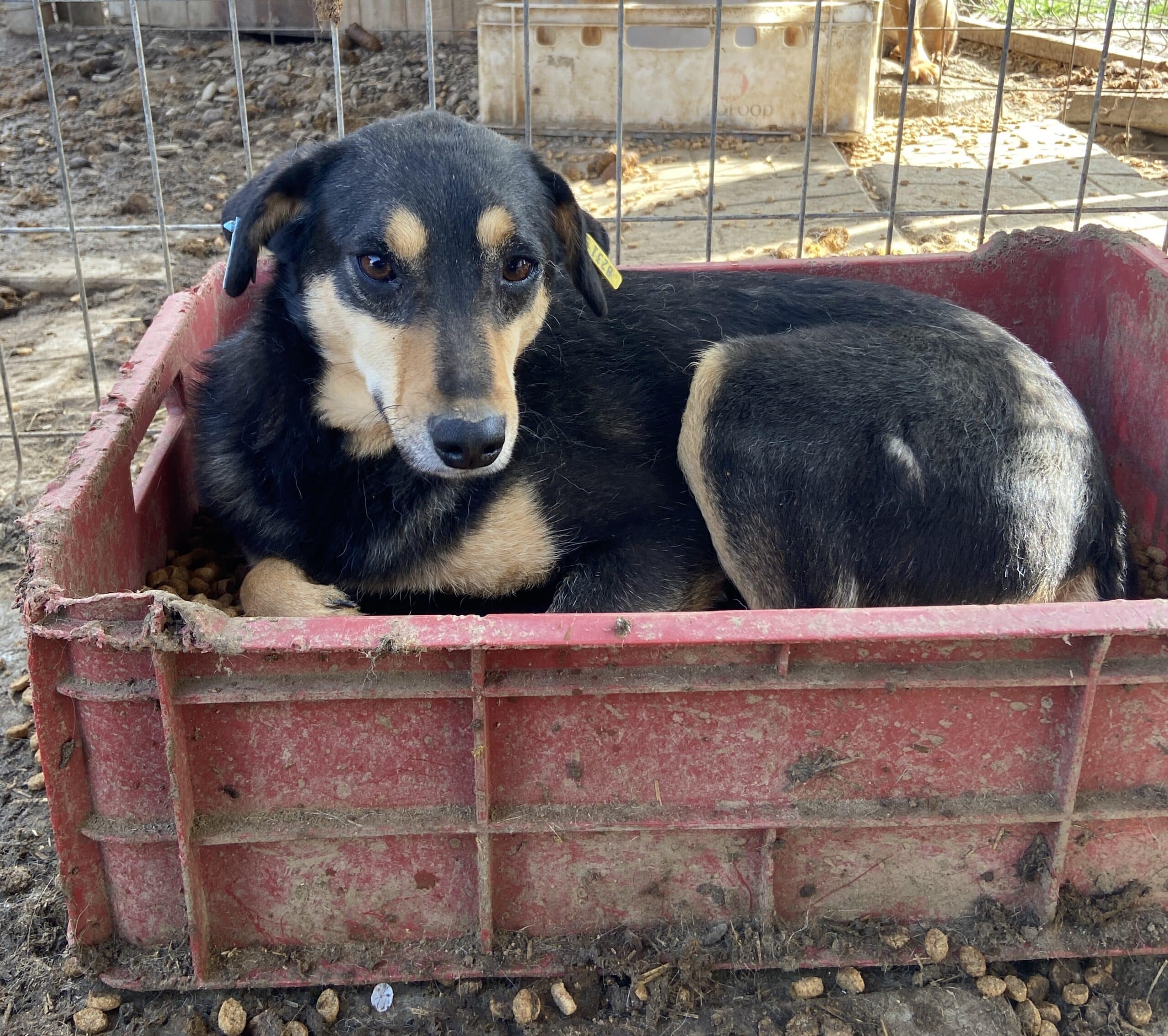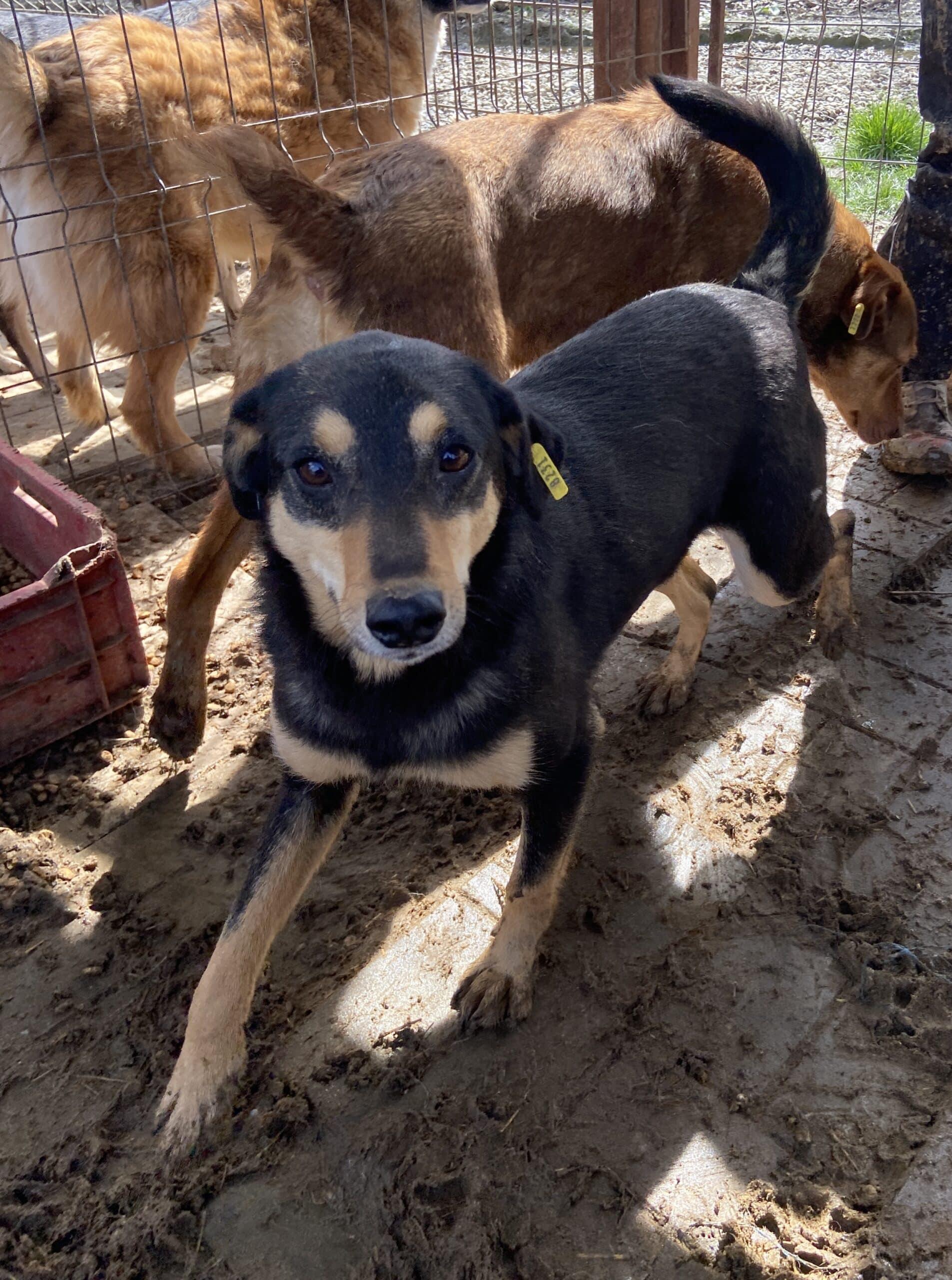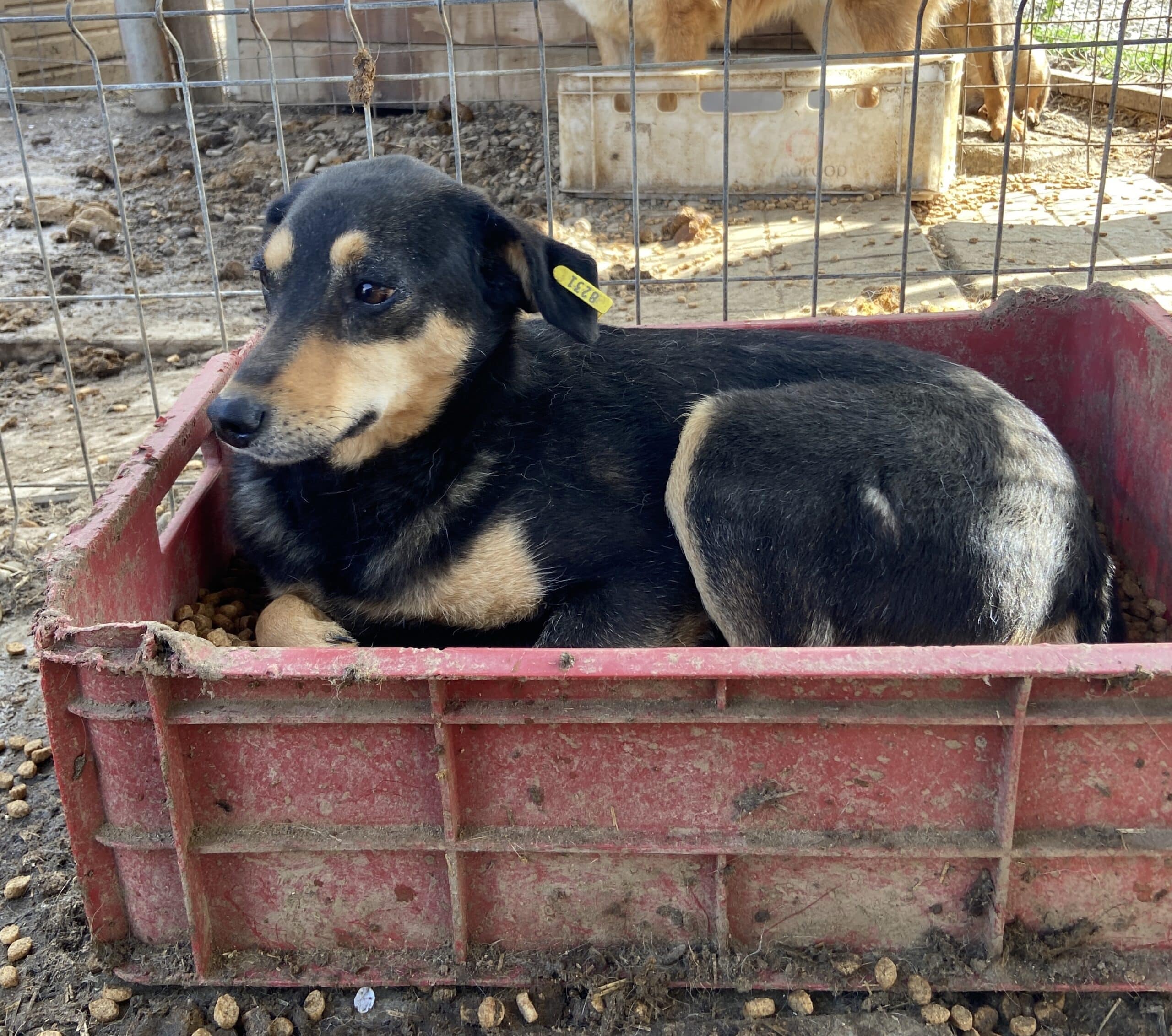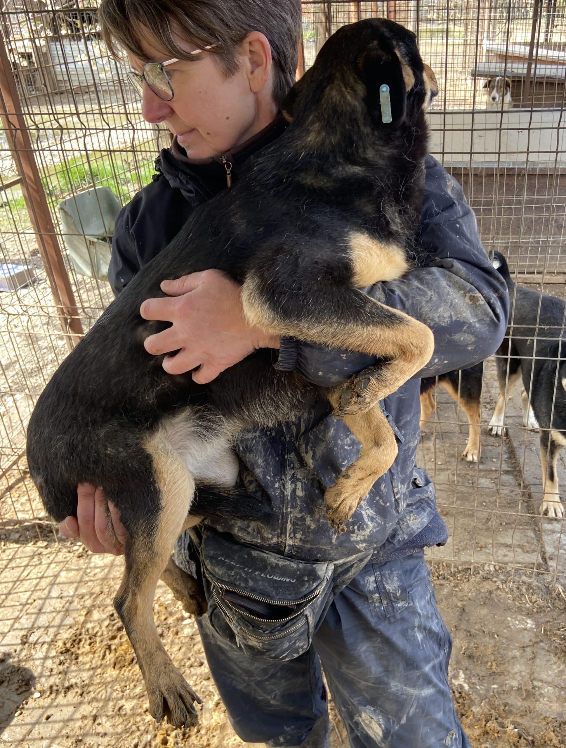 - sitzt mit ihren eigenen und vielen anderen Welpen in einem trubeligen Kennel, hält sich da eher im Hintergrund