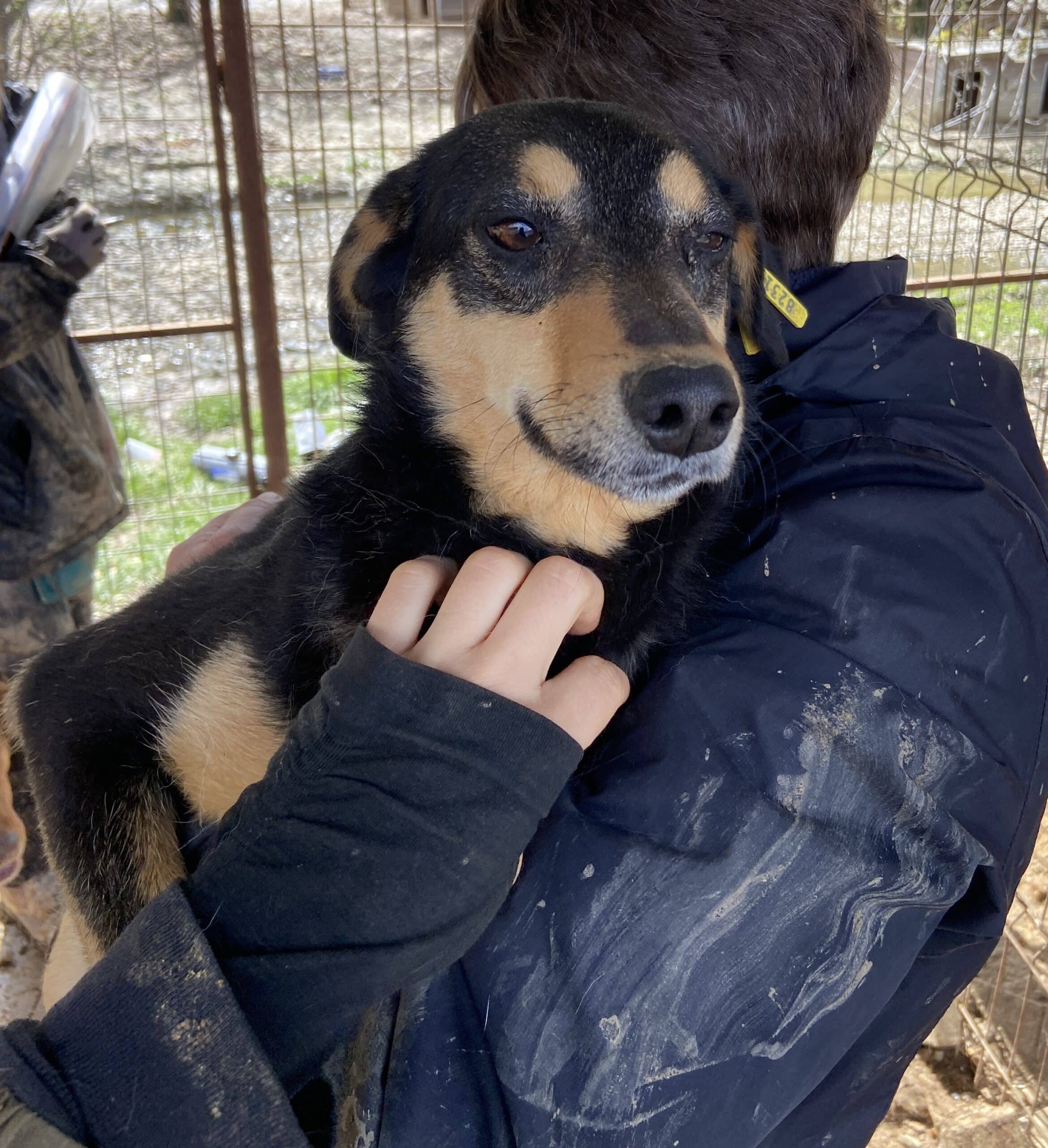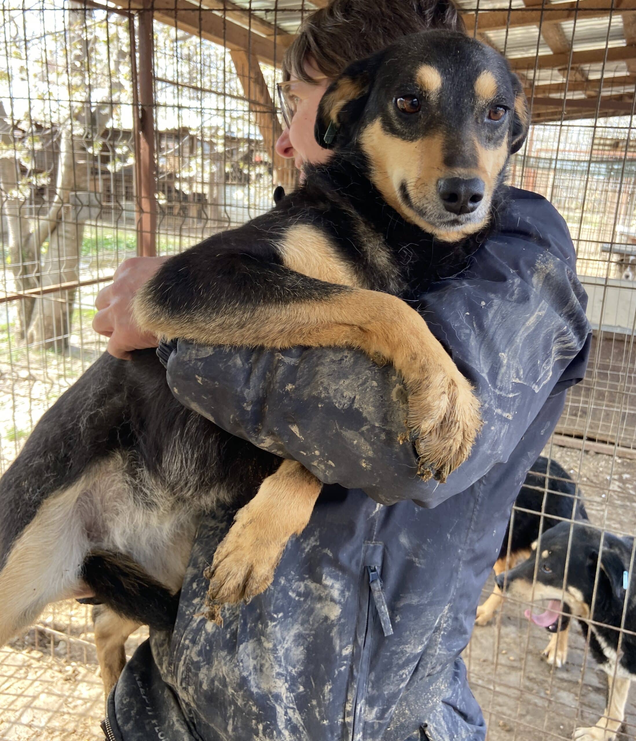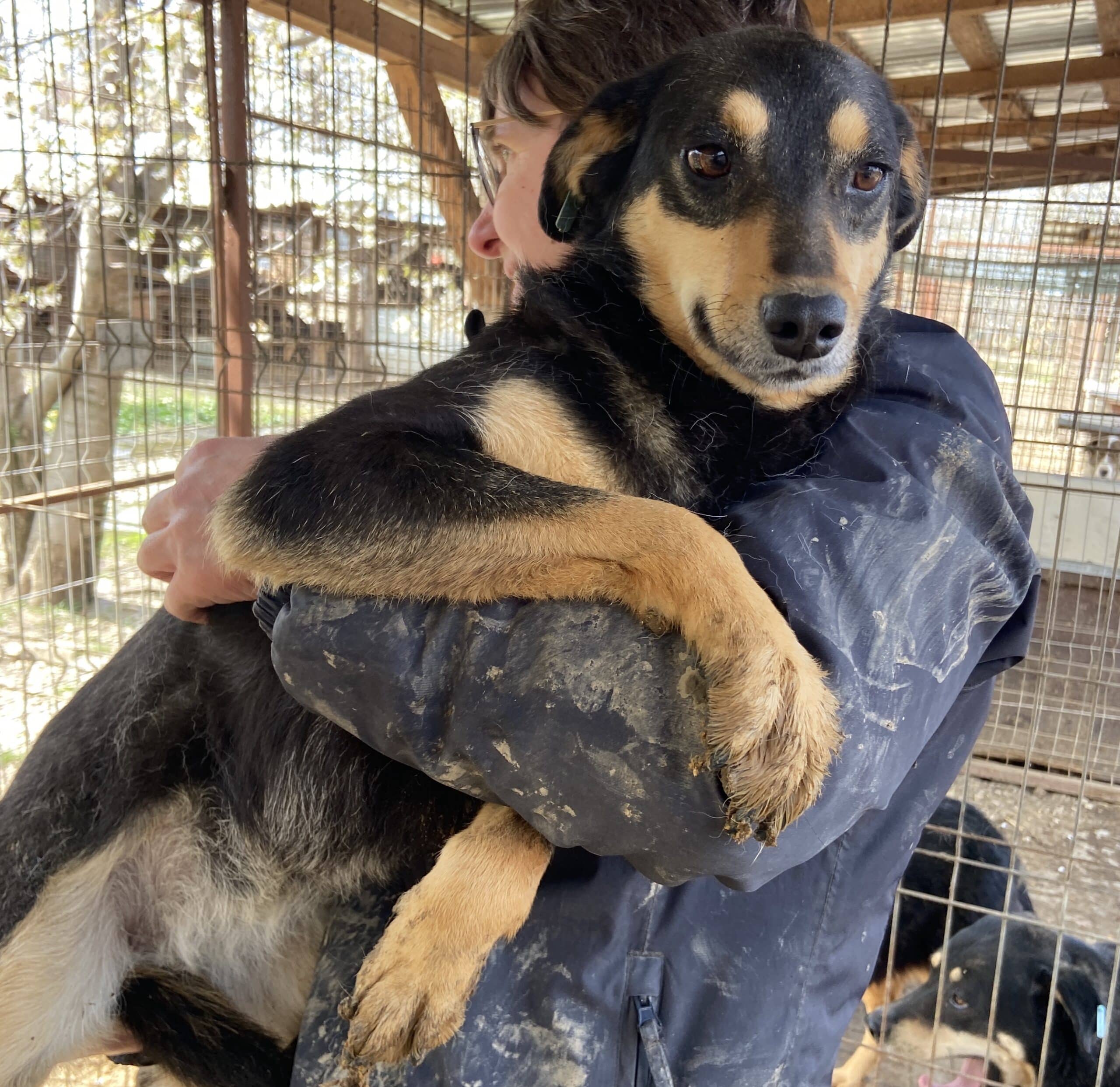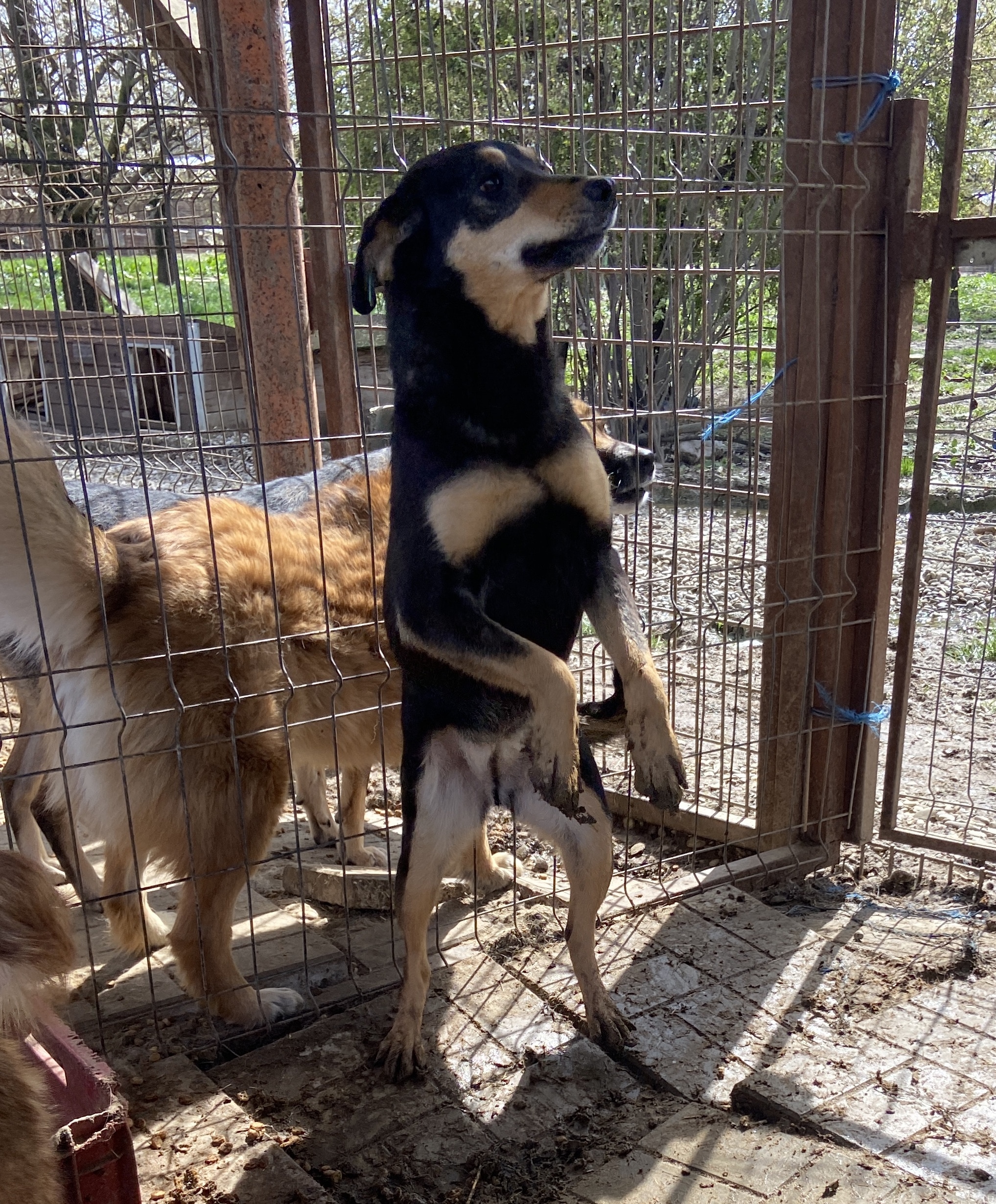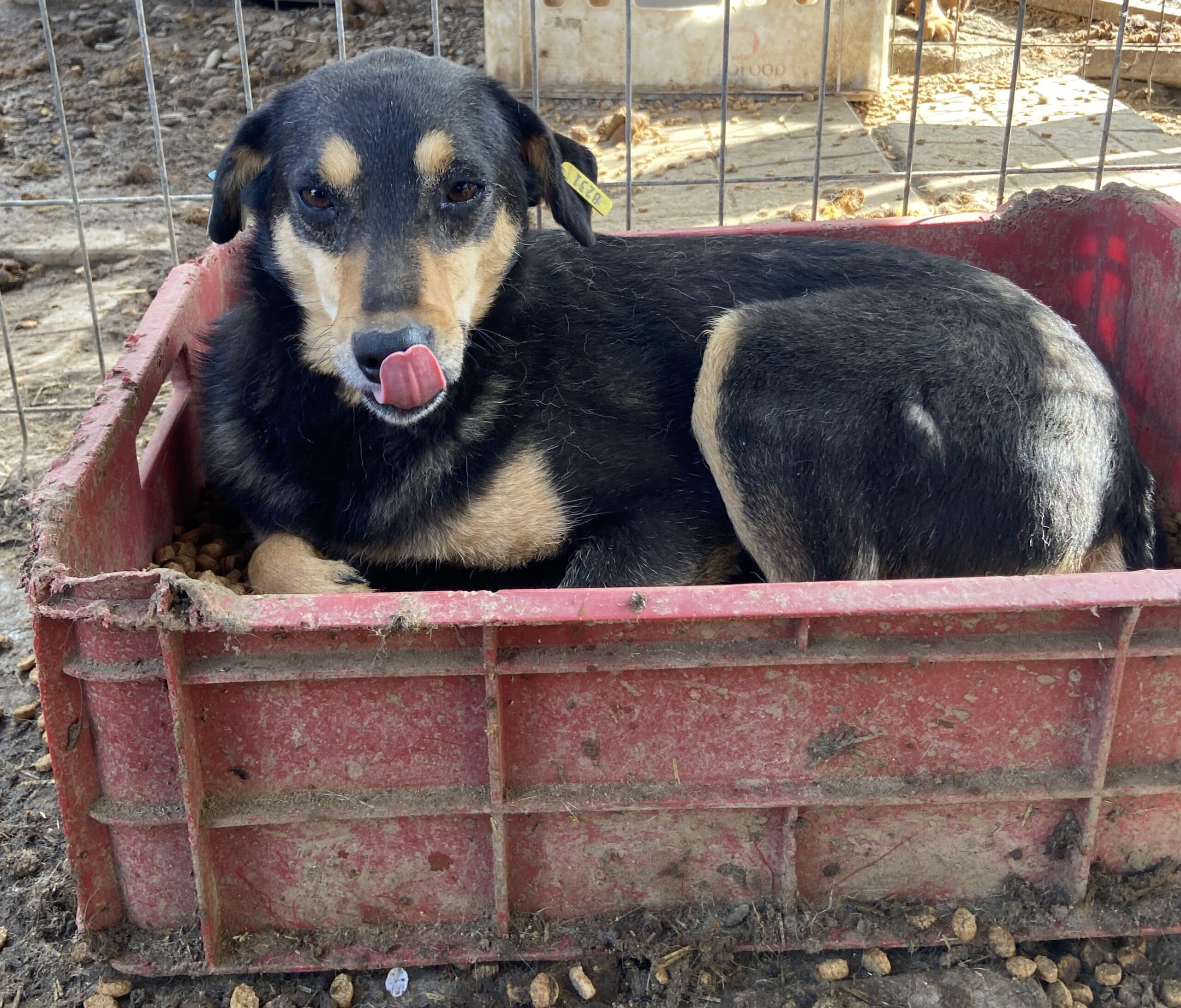 - sitzt mit ihren eigenen und vielen anderen Welpen in einem trubeligen Kennel, hält sich da eher im Hintergrund