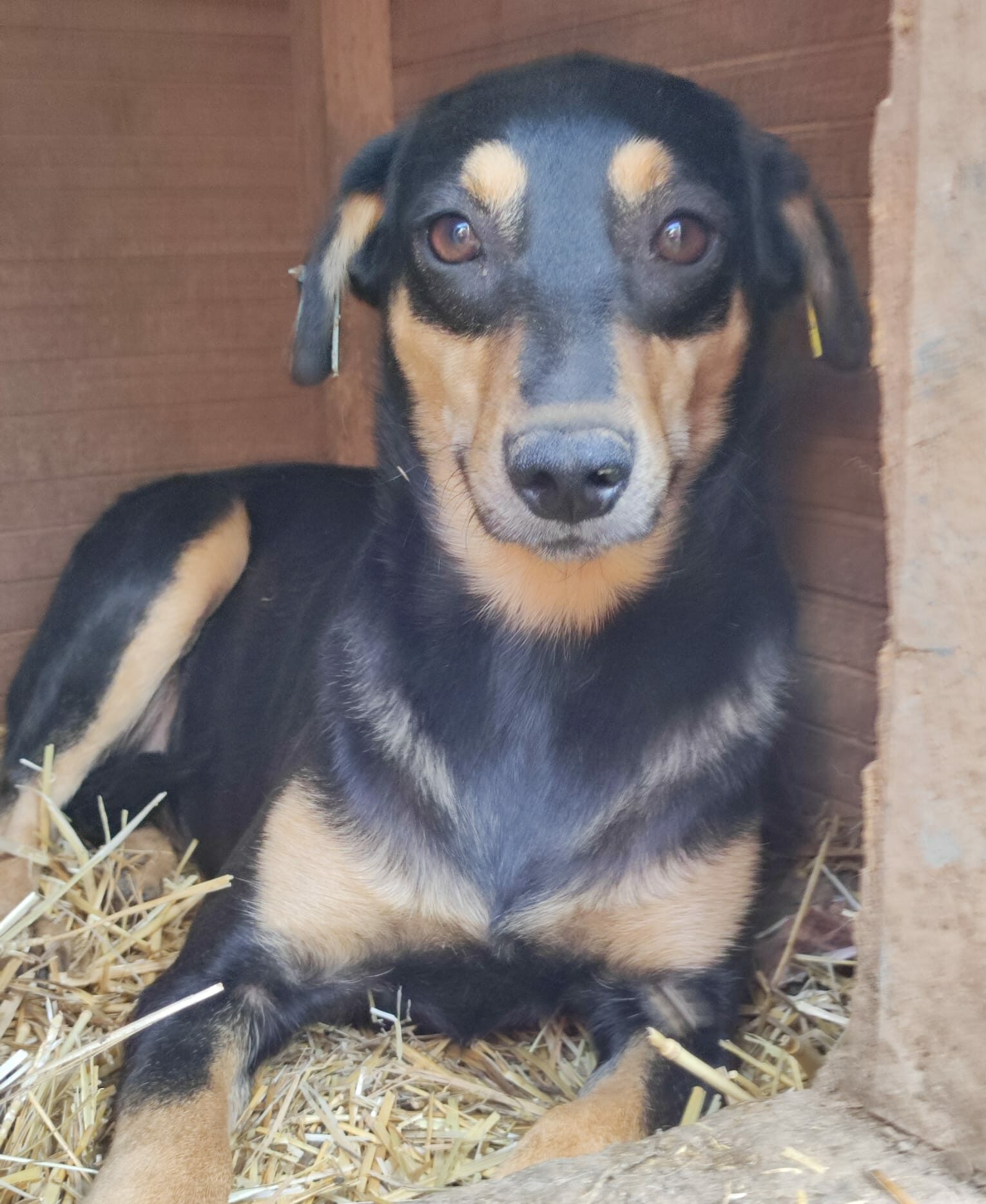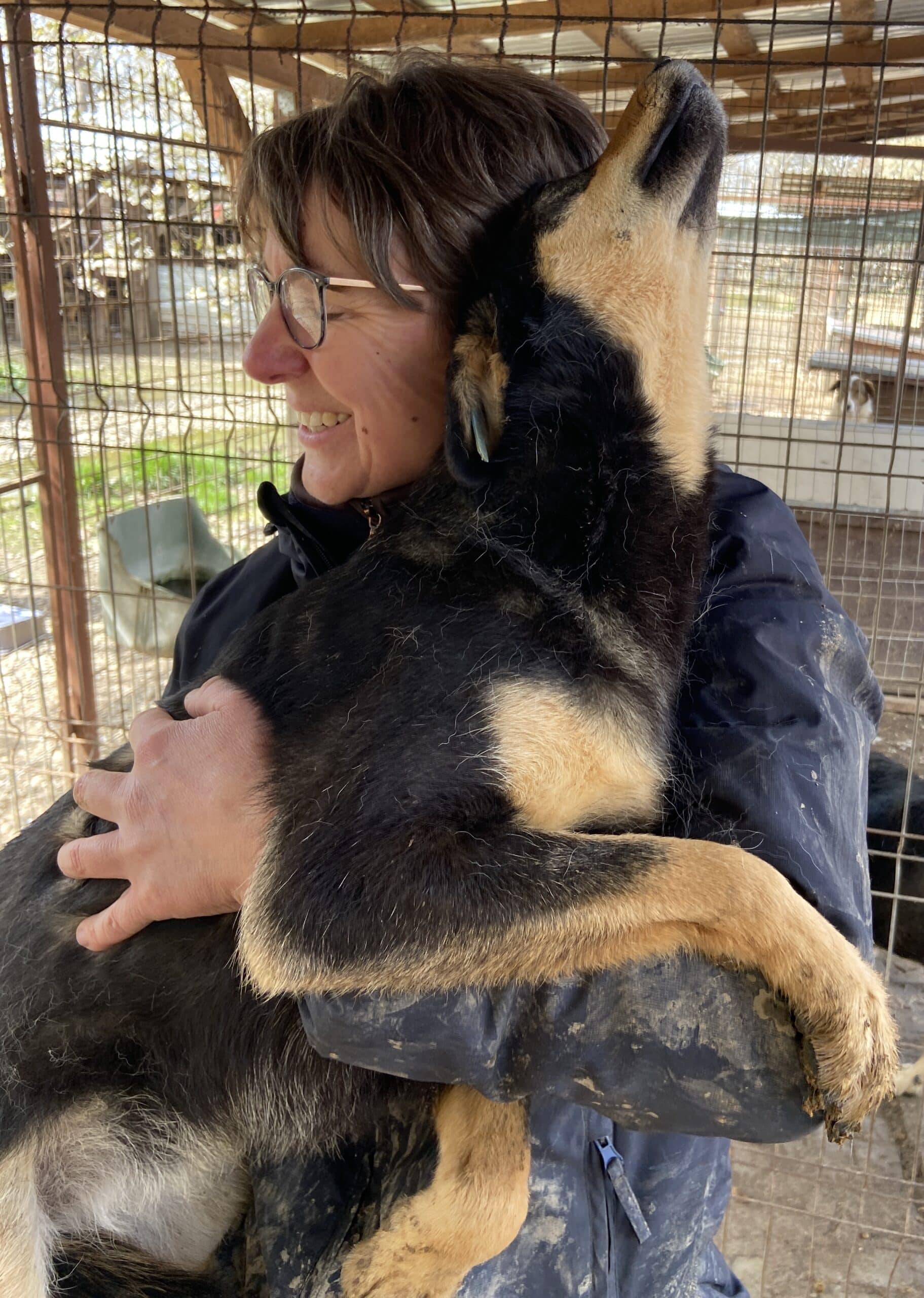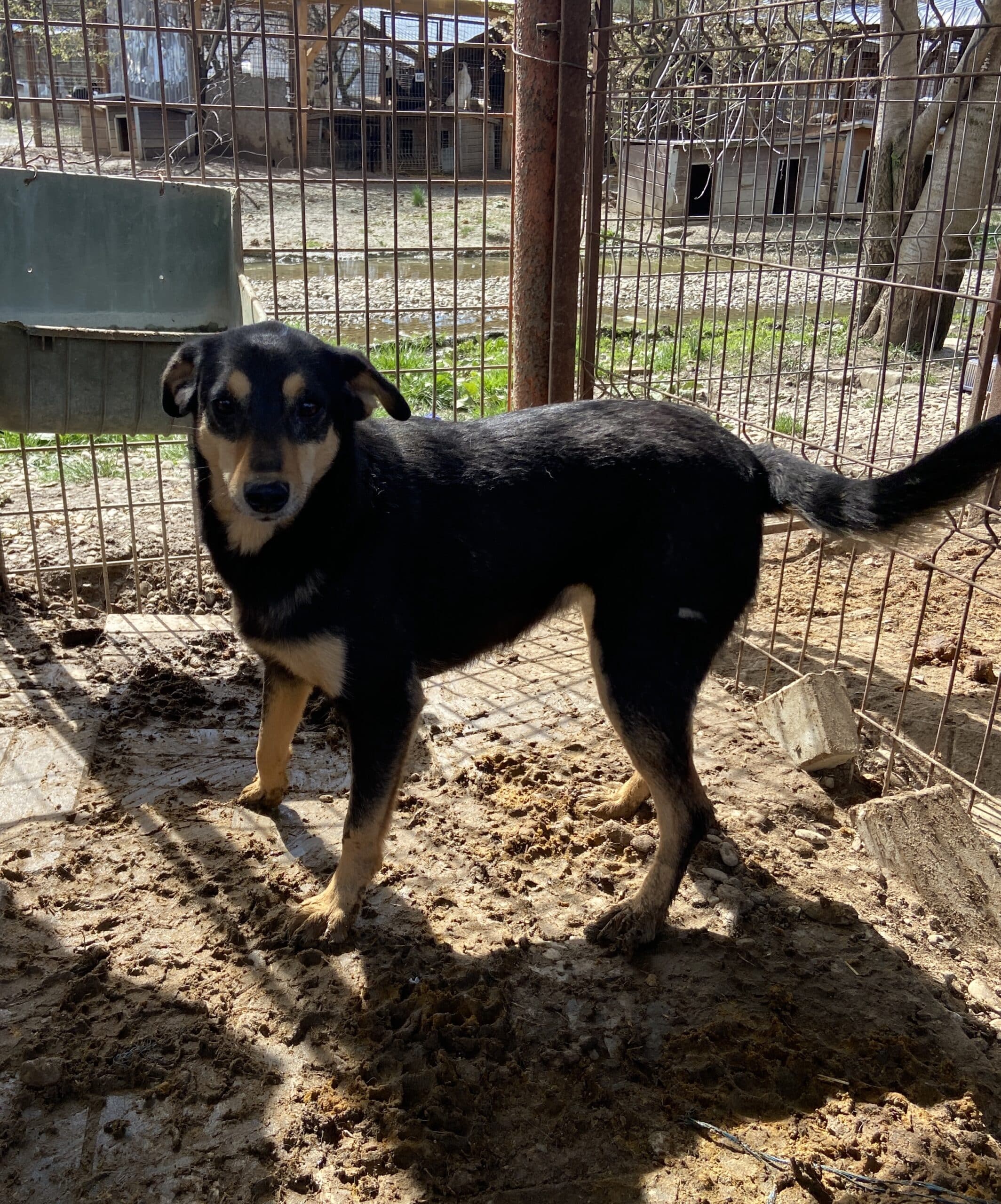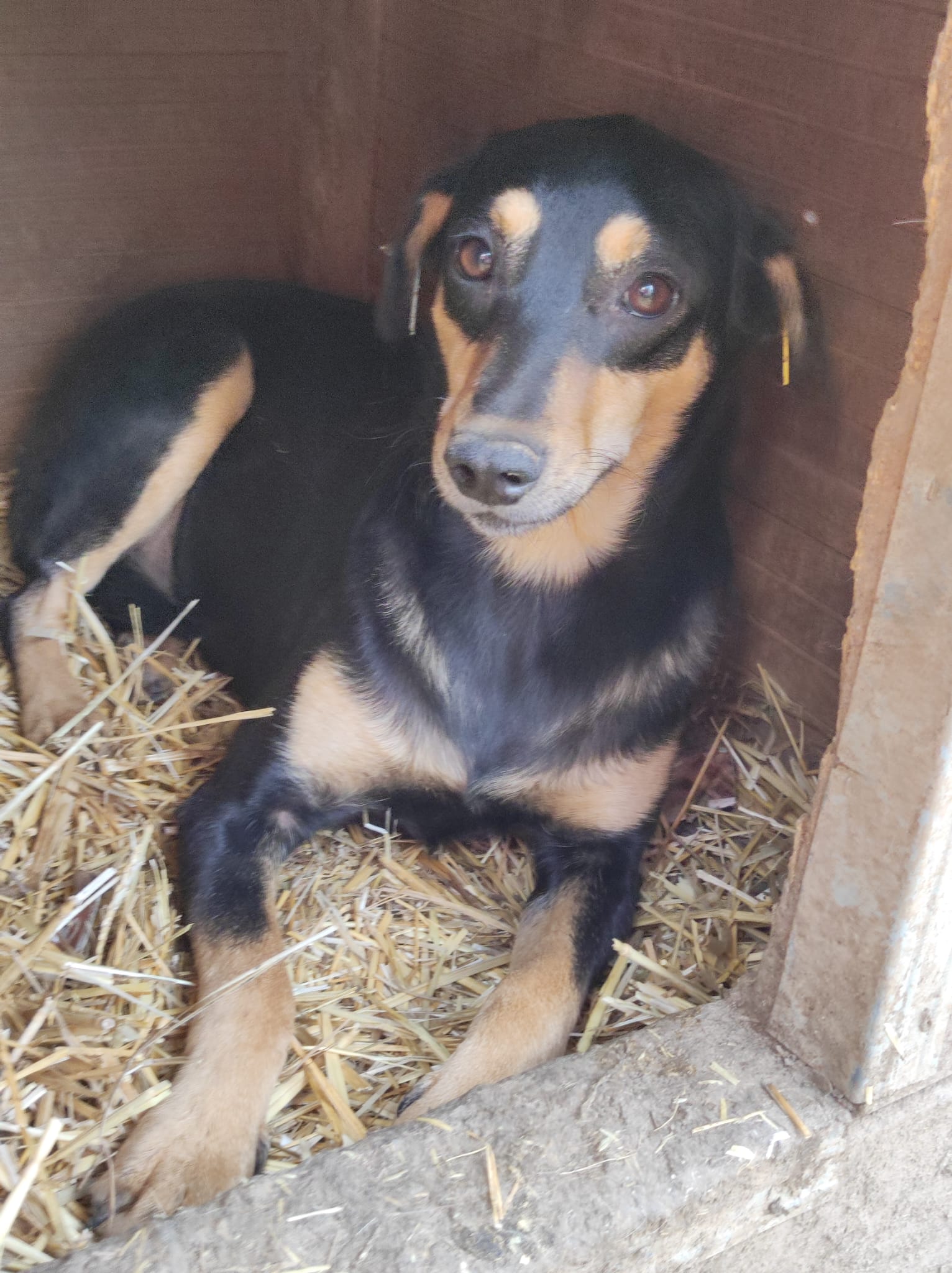 - sitzt mit ihren eigenen und vielen anderen Welpen in einem trubeligen Kennel, hält sich da eher im Hintergrund