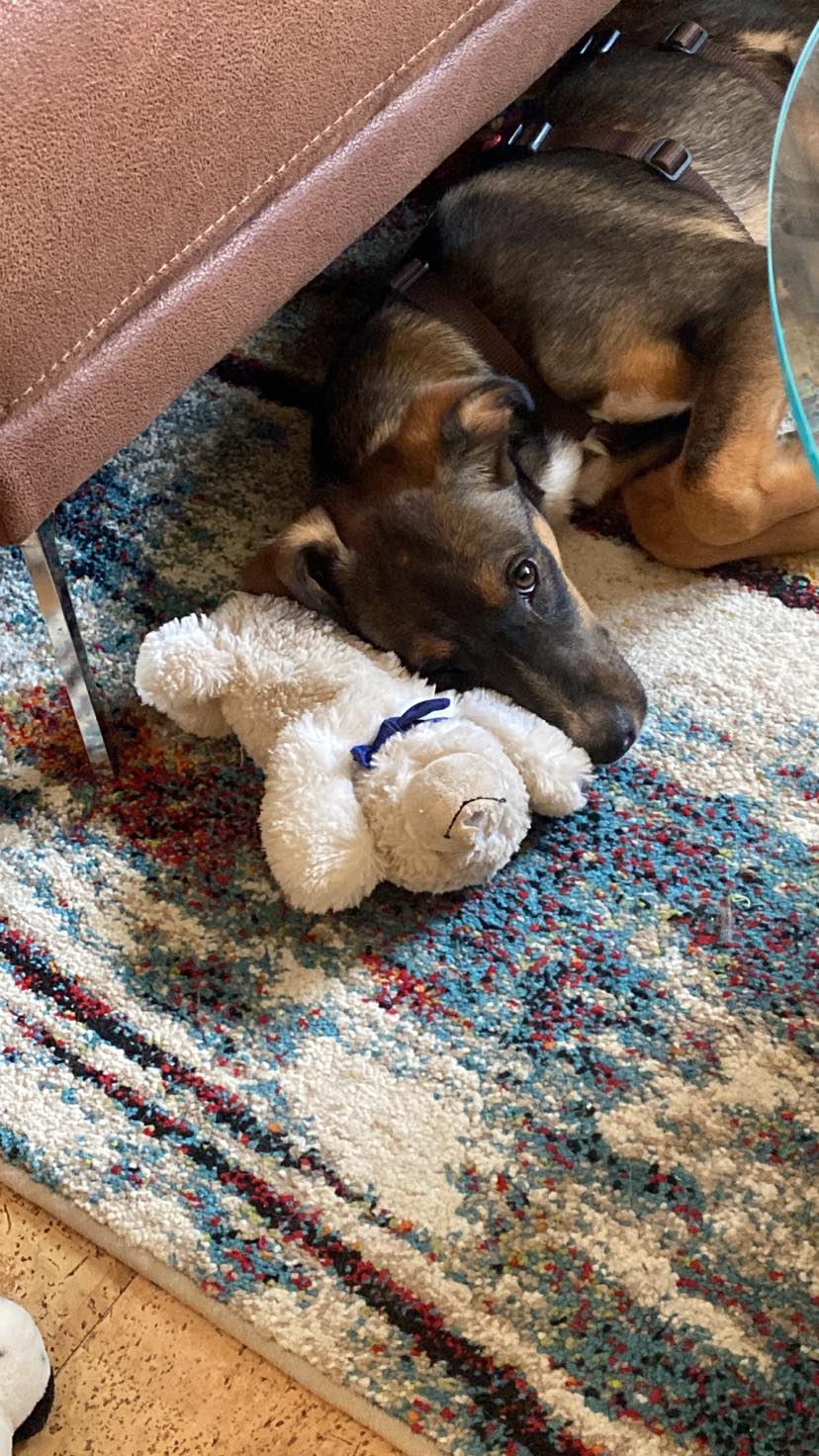Er fährt gut Auto, kann bereits mit der vorhandenen Hündin 3 Stunden alleine bleiben, ist stubenrein, läuft Treppen wie ein Großer und mag Katzen.
