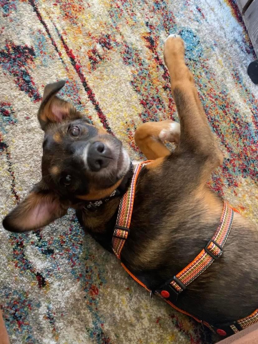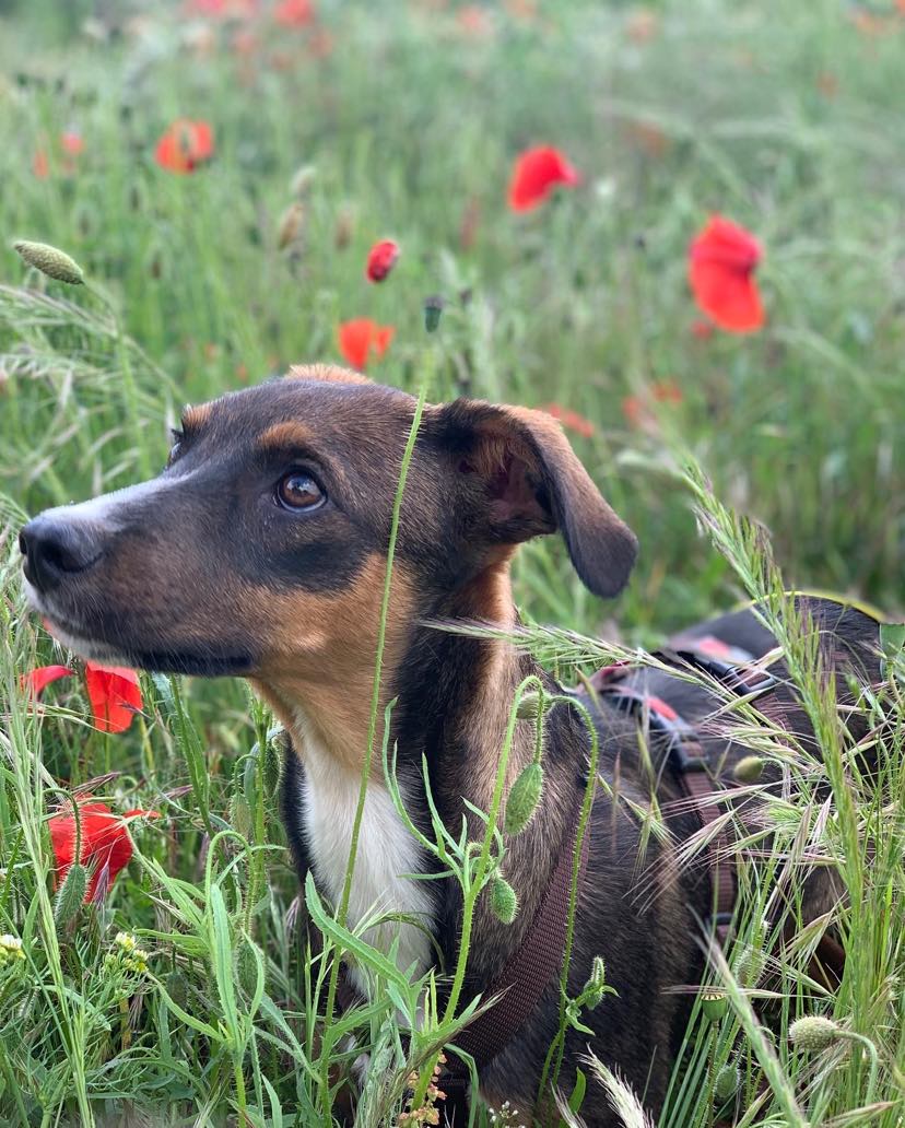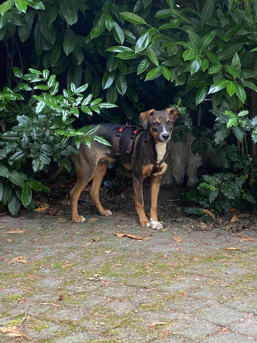 An der Leine verhält Ando sich sehr gut. Vor größeren Hunden hat er noch etwas Angst, allerdings legt sich dies beim ersten beschnuppern.