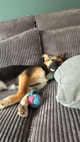 Mitte Oktober durfte dieses süße und fröhliche Welpenmädchen zu uns nach Köln reisen. Seitdem hat sie sich ganz wunderbar in das Rudel eingeführt und orientiert sich besonders an ihrer Pflegeschwester, die ihr in noch unbekannten Situationen Sicherheit gibt. Unterwegs ist Angel mal mutig und fröhlich, manchmal aber auch noch sehr beeindruckt von den vielen Reitzen. Sie will zwar nicht flüchten und ist auch nicht besonders geräuschempfindlich aber man merkt ihr manchmal an, wie nervös sie wird, wenn zu viel los ist. Das hat unserer Meinung nach aber auch was mit dem Alter zu tun, denn schüchtern oder ängstlich passt nicht so wirklich zu Angel, sie ist einfach noch sehr jung. Mit unseren beiden Hunden zeigt sie sich besonders verträglich, auch wenn sie von unserem Ersthund ab und an in die Schranken gewiesen wird. Sie lässt sich das brav gefallen, hat Respekt vor ihm, versucht aber immer wieder Kontakt aufzunehmen mit ganz vorsichtigen Schritten, was wirklich niedlich und herzerweichend ist.