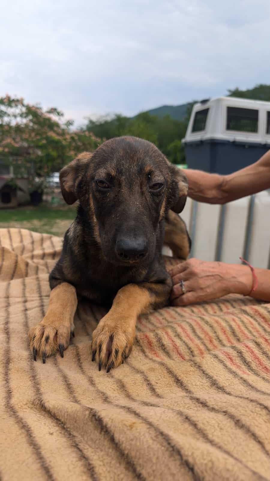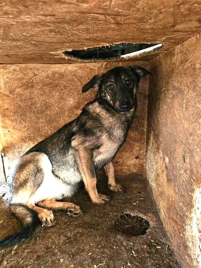 Unsicher liegt ANGUS auf seinem Hüttendach und beobachtet uns. Er weiß noch nicht so recht was er mit uns anfangen soll, deswegen bellt er erstmal. Nach kurzer Zeit lies er sich jedoch überall anfassen, konnte es aber noch nicht genießen. Er wünscht sich Menschen die seine Neugier erkennen und ihm Vertrauen schenken.