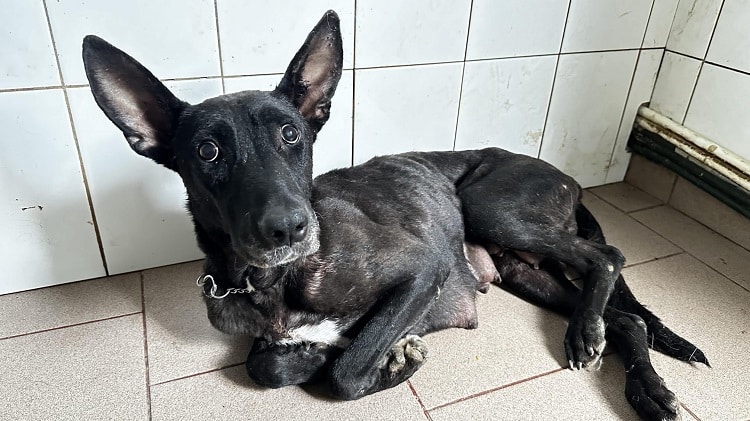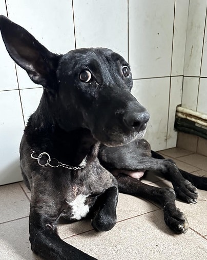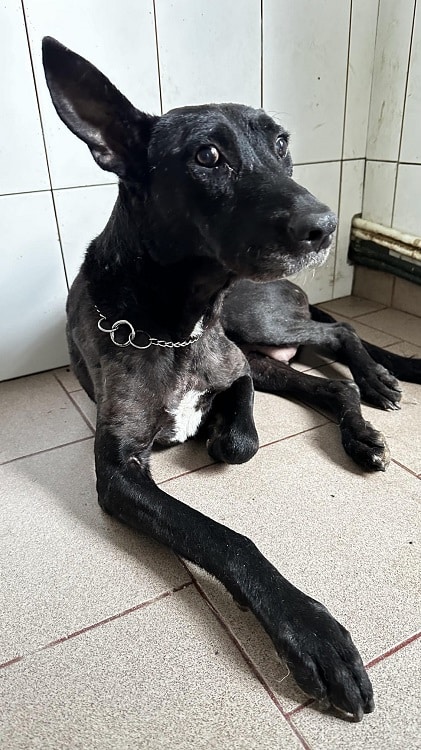 Anisias Blick verrät, dass sie aktuell noch ankommen muss. Sie ist noch etwas durch den Wind. Wen wundert es, sie sollte eigentlich nur zum Kastra Event kastriert werden und danach wollte sie ihr Besitzer nicht mehr und liess sie einfach da. Vielleicht war es aber auch das Beste, wenn man ihren Zustand betrachtet, abgemagert, Narben au der Haut, eine stark ausgeprägte Gesäugeleiste… wahrscheinlich hatte sie nicht nur einmal Welpen. Das Streicheln kann sie noch nicht so geniessen, wir wissen auch nicht welche Erfahrungen sie damit hat. Aber sie lässt es geschehen und bleibt dabei liegen. Sie wird es sicher auch in einem sicheren zu hause bald geniessen können.